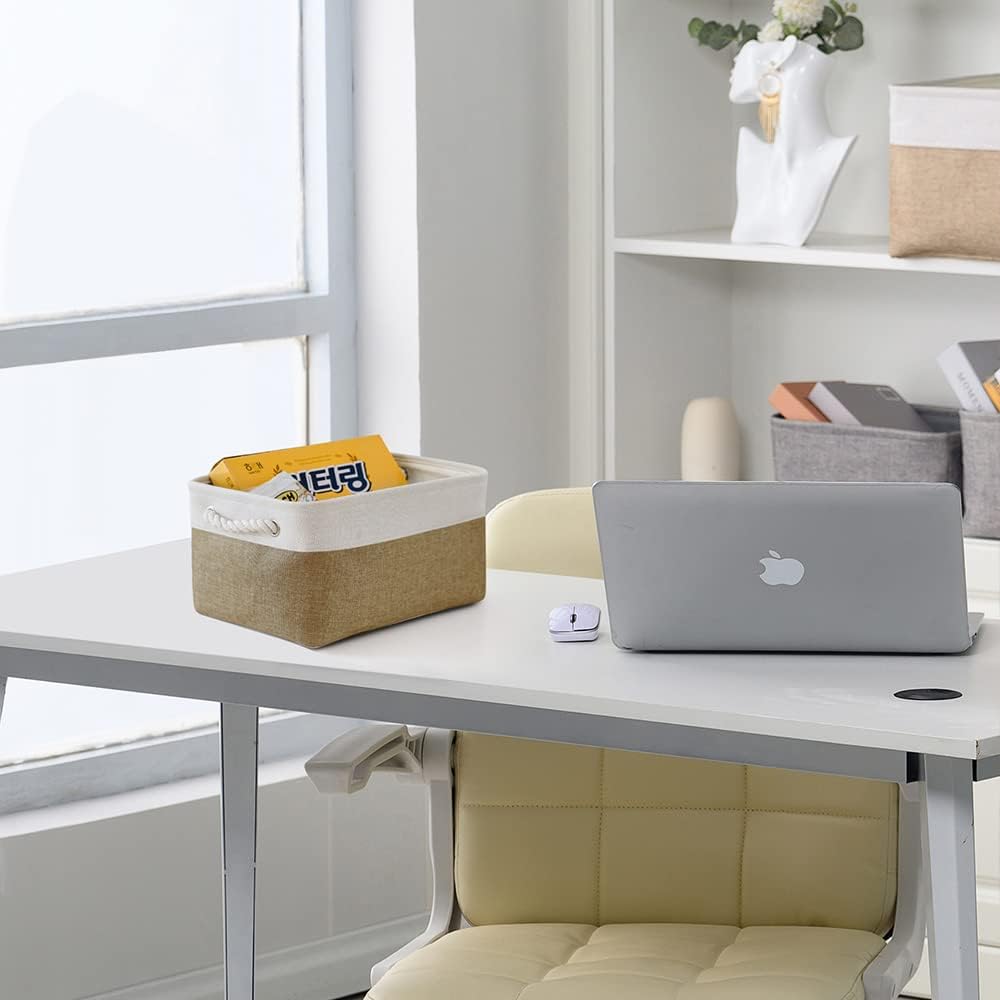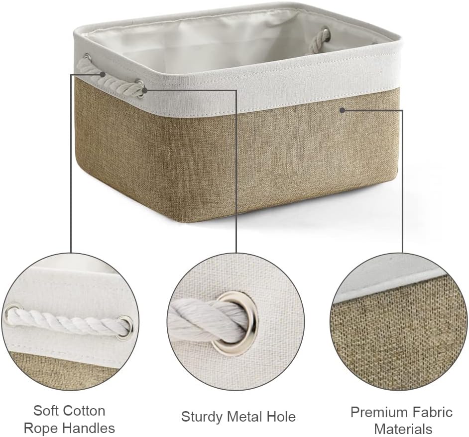TheWarmHome Storage Basket for Organizing - 14x10x7 inch Medium 3 Pack Collapsible Storage Bin for Shelves with Handles, Canves Storage Box for Organizer Cubes Cloth Gift Toy Closet (White & Khaki)