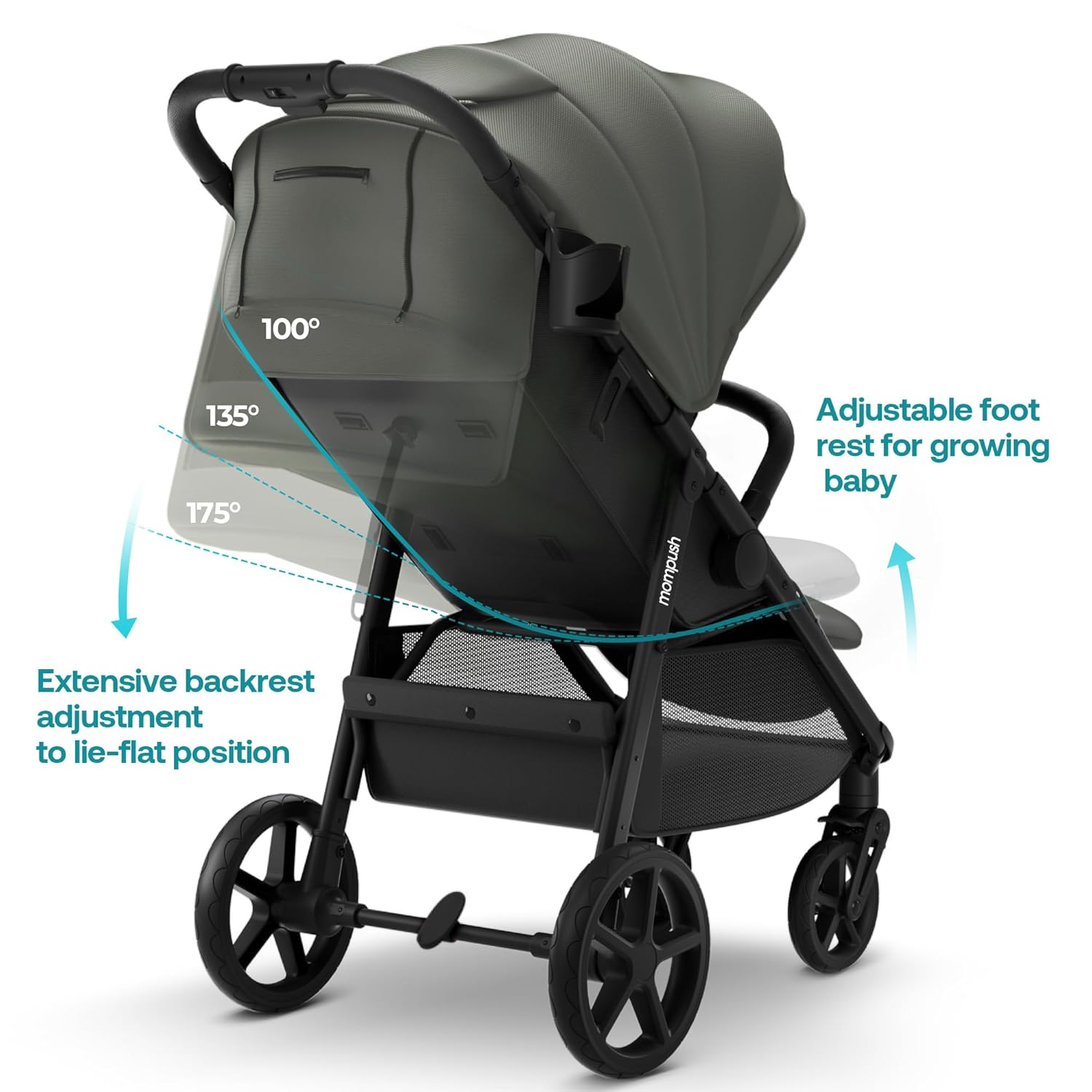Mompush Nova Baby Stroller for Toddler, Infant & Newborn | Spacious Seat & Lie-Flat Mode | Compact One-Hand Fold, UPF 50+ Canopy & All-Wheel Suspension | Includes Rain Cover & Cup Holder, Green