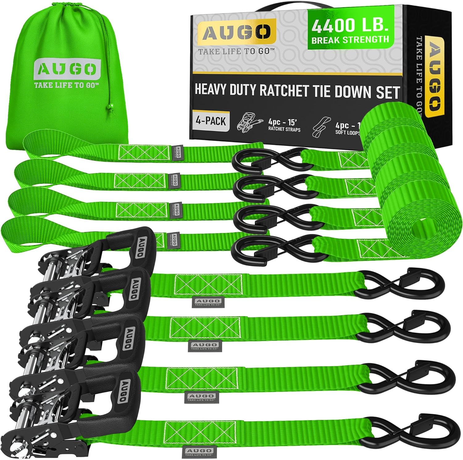 AUGO Heavy Duty Ratchet Straps & Soft Loops – Pack of 4 Extra Strong 1.5” by 15’ Ratchet Straps w/S-Hook Safety Latches & 4 Soft Loop Tie Downs – 4400Lb Break Strength for Motorcycles, ATVs, Etc.