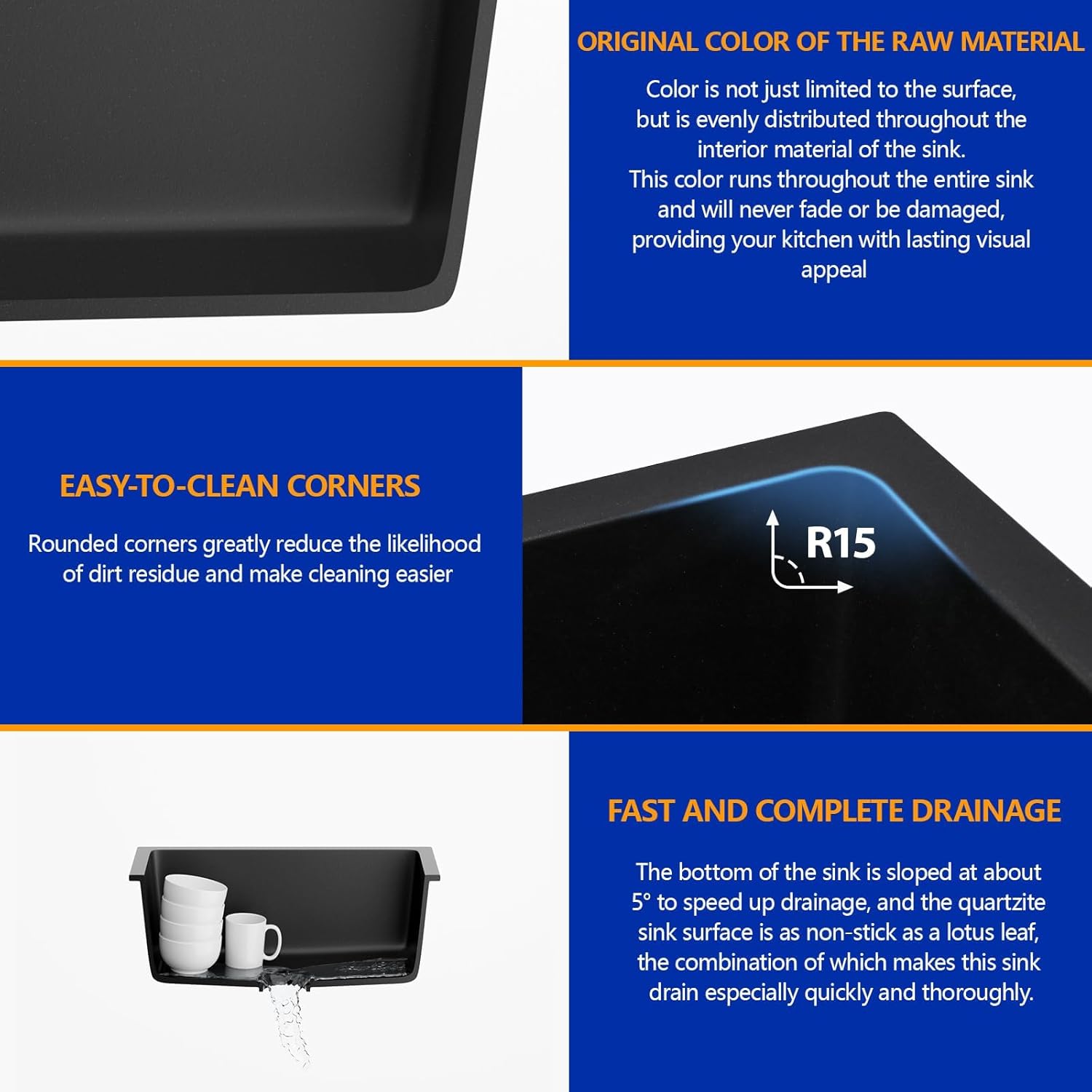 - Noise Reduction--Unlike traditional stainless steel sinks, this Quartz Composite sink excels in sound absorption, reducing noise from water flow and dishware clatter, creating a more peaceful kitchen environment.