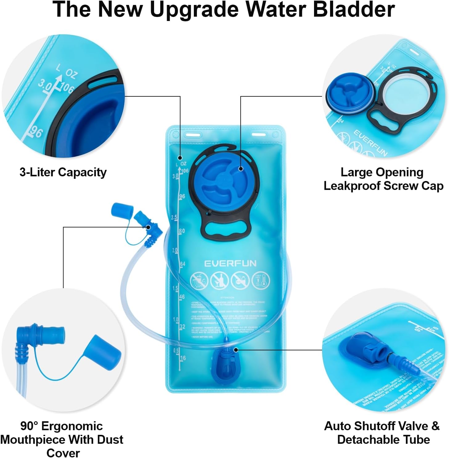 - EFFICIENT HYDRATION SYSTEM: This 18L hydration backpack includes an UPGRADED 100 oz / 3-LITER water bladder made of FOOD-GRADE PEVA material. The water Pouch has a Large Opening for easy refilling with water, ice cubes and cleaning. The high-flow bite valve is ergonomically designed for more comfortable use. The mouthpiece cover protects the bite valve against dirt and damage.