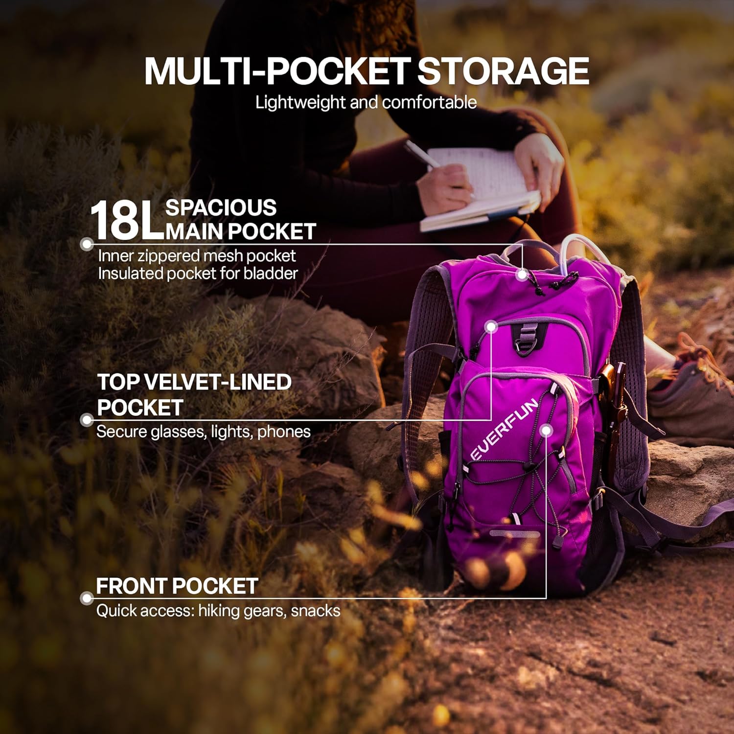 - UTMOST STORAGE CAPACITY: Backpack size 18.5" x 10.5" x 6". Stay organized with 9 functional divider pockets to keep all your essentials secure. The 18-LITER main compartment is large enough for clothes, notebooks, first-aid kit, pet supplies. Built-in mesh pocket for personal valuables. Exterior upper velvet pocket for protecting glasses, cameras, cell phones. Trekking poles/water bottles fit in the side mesh pockets for easy access.