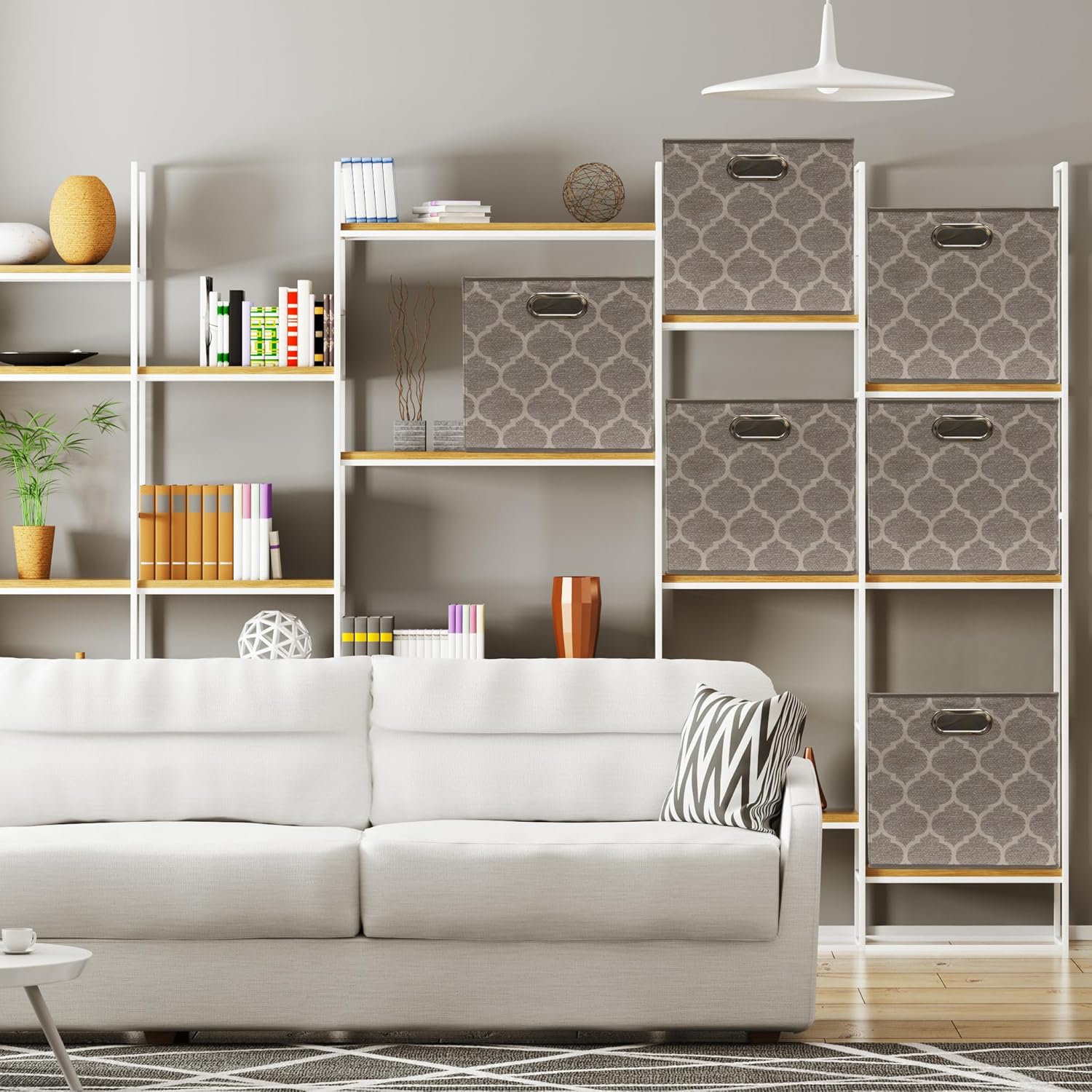 - Space-Saving Design: Collapsible fabric bins with a stylish print; foldable for compact storage when not in use