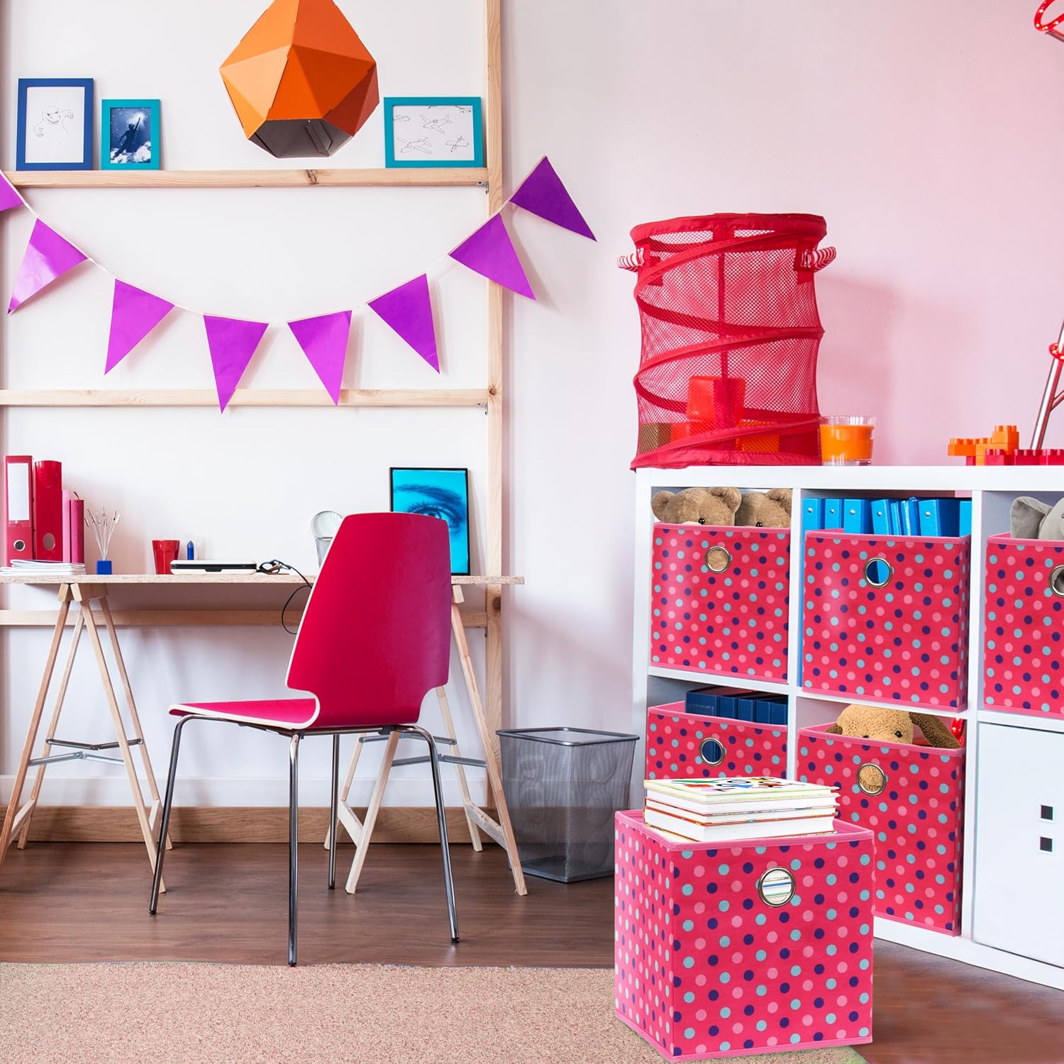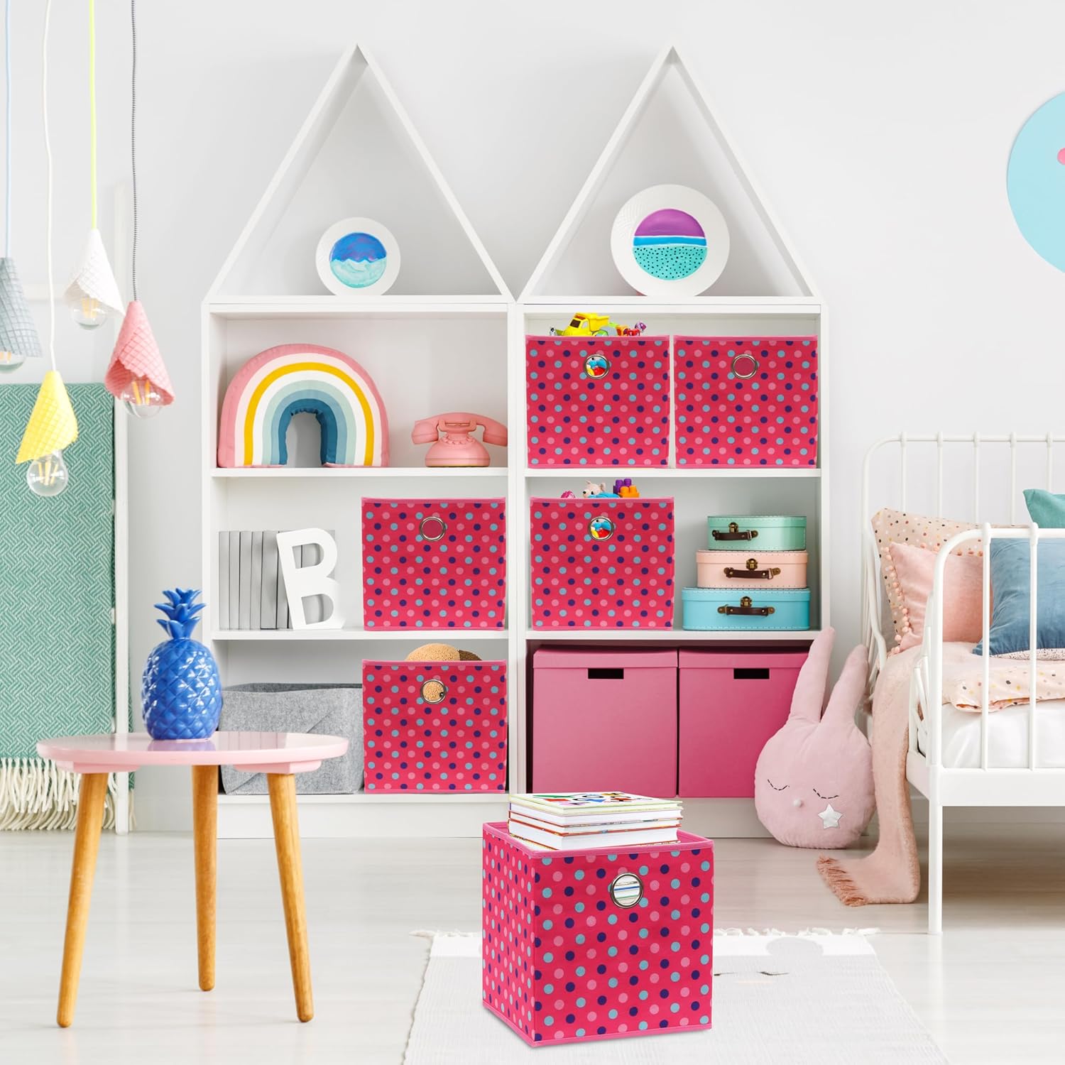 - Space-Saving Design: Collapsible fabric bins with a stylish print; foldable for compact storage when not in use