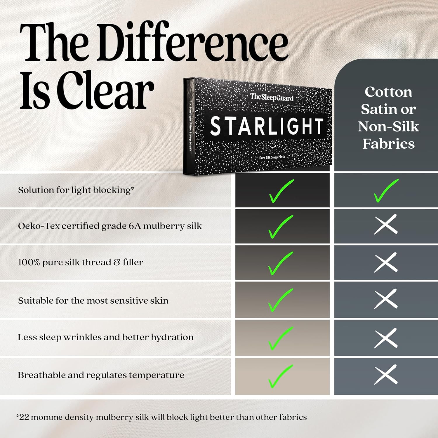 - ✅ INVEST IN YOUR SLEEP - Experience TheSleepGuard difference with our luxury sleeping masks. Crafted from the highest grade 6A Mulberry silk at 22 momme and certified by Oeko-Tex to ensure you sleep soundly. Remember, better sleep leads to a better you.