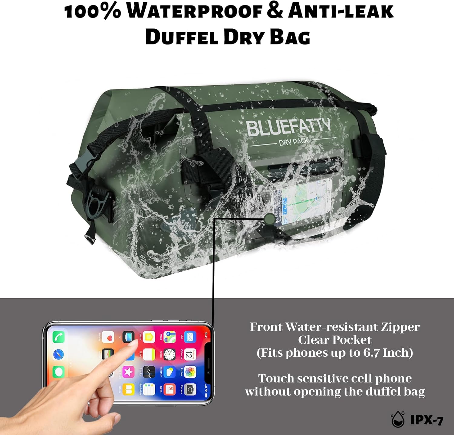 - 100% Waterproof & Durable: BLUEFATTY dry duffel bag is made of high strength waterproof 500D PVC material with high frequency welded seams; all major pressure points are double reinforced so that it's durable enough and reach 100% waterproof level: IPX7.