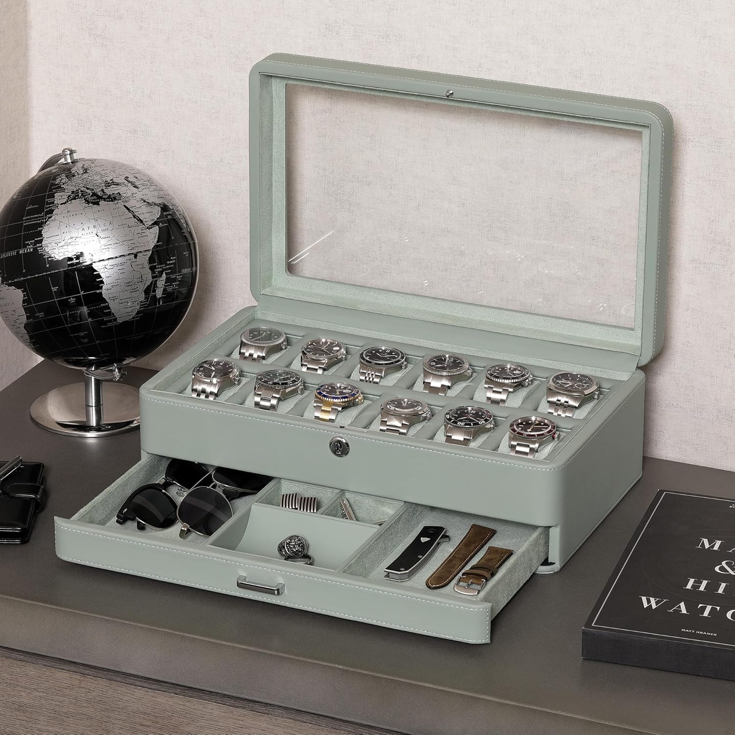 - VALET DRAWER: The slide out drawer in our watch display case can hold additional watches and watch straps or provide extra space to keep your cufflinks, rings, tie clips, sunglasses, pens, money, cards or watch tools.