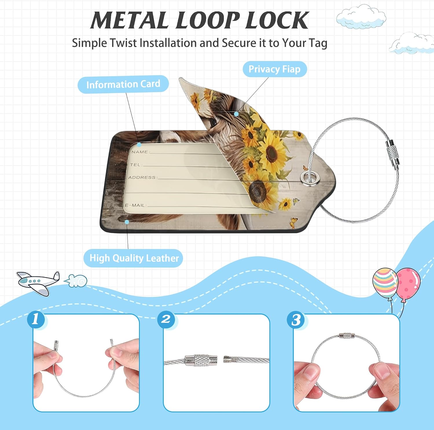 - 【Protect Your Information】: Each luggage tag comes with a privacy cover, ensuring that your personal details are not easily visible to others. The tag also includes a small information sheet where you can fill out your contact information, allowing for easy identification and assistance in the event of lost luggage.
