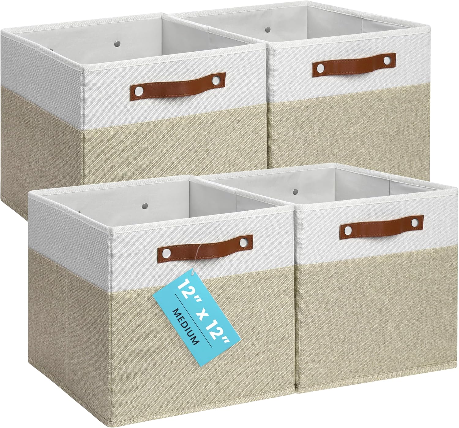 OrganiHaus 12x12 Fabric Storage Bins - Set of 4, Cube Fabric Organizer Bins with Vegan Handles, Kallax Storage Cubes, Cubbies Organizer Boxes, 12Inch Cubic Baskets for Shelves - Beige/White