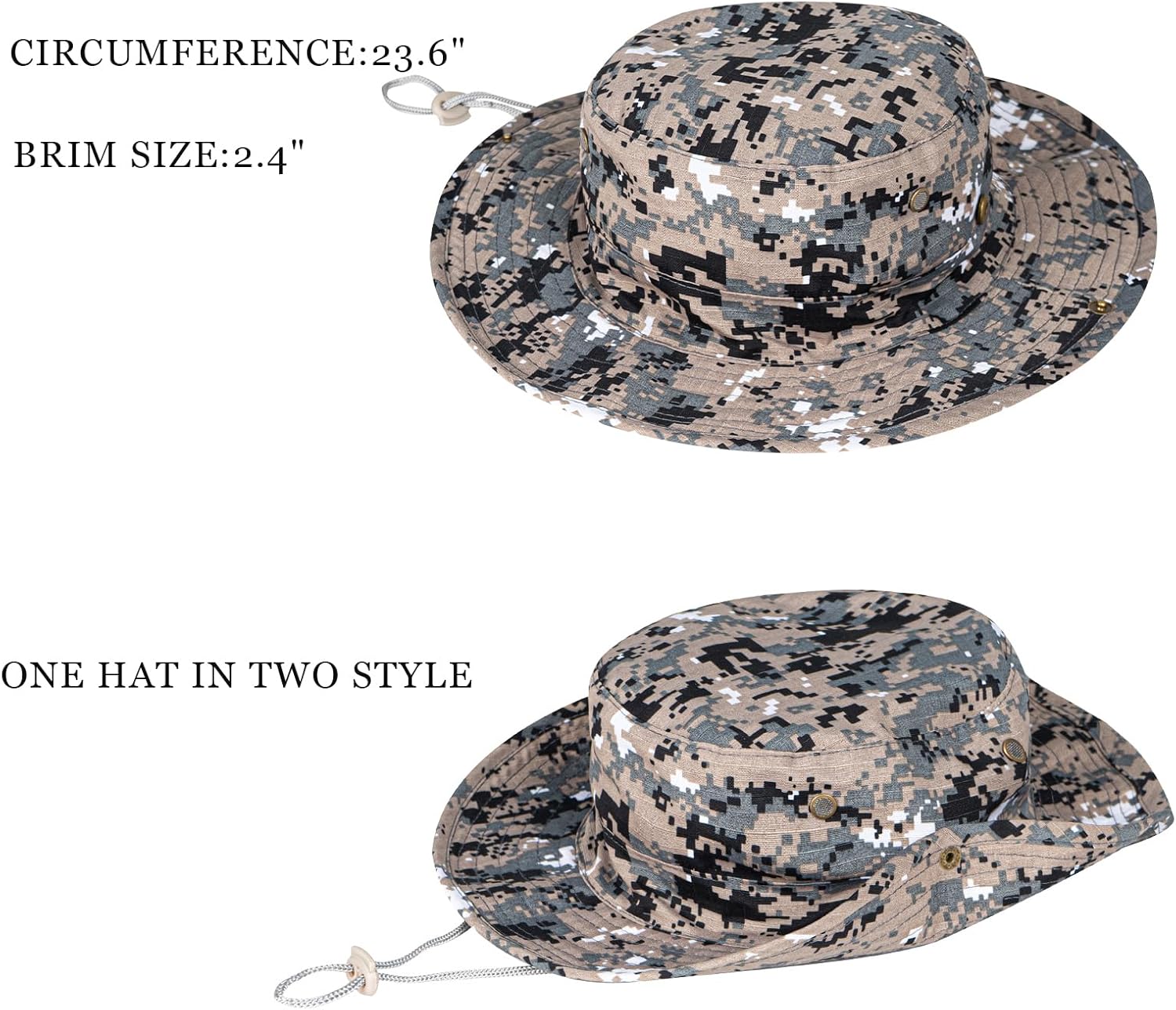 - SAFARI STYLE BOONIE HAT: The foldable brim and side snaps offer versatile styling options, you can clasp the buttons on both sides of the hat to convert it into different styles (cowboy caps). With this hat, you can easily customize your look to suit any occasion.