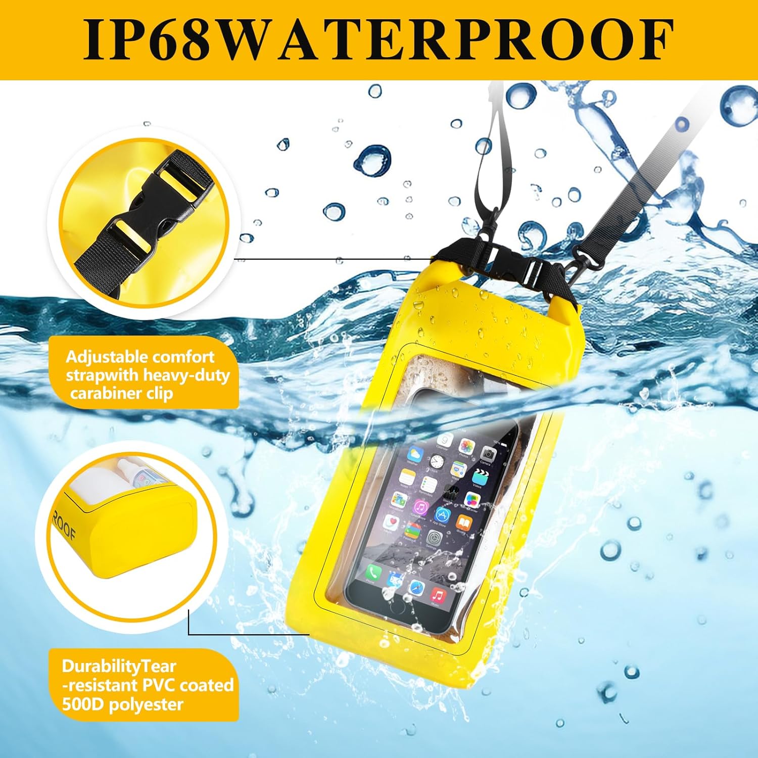 IP68 Waterproof Dry Bag, 2L - Roll Top Waterproof Pool Bag,Dry Bags for Kayaking Waterproof-w/Phone Pouch,Large Waterproof Phone Pouch,Boating & Kayak Accessories Camping (Yellow)