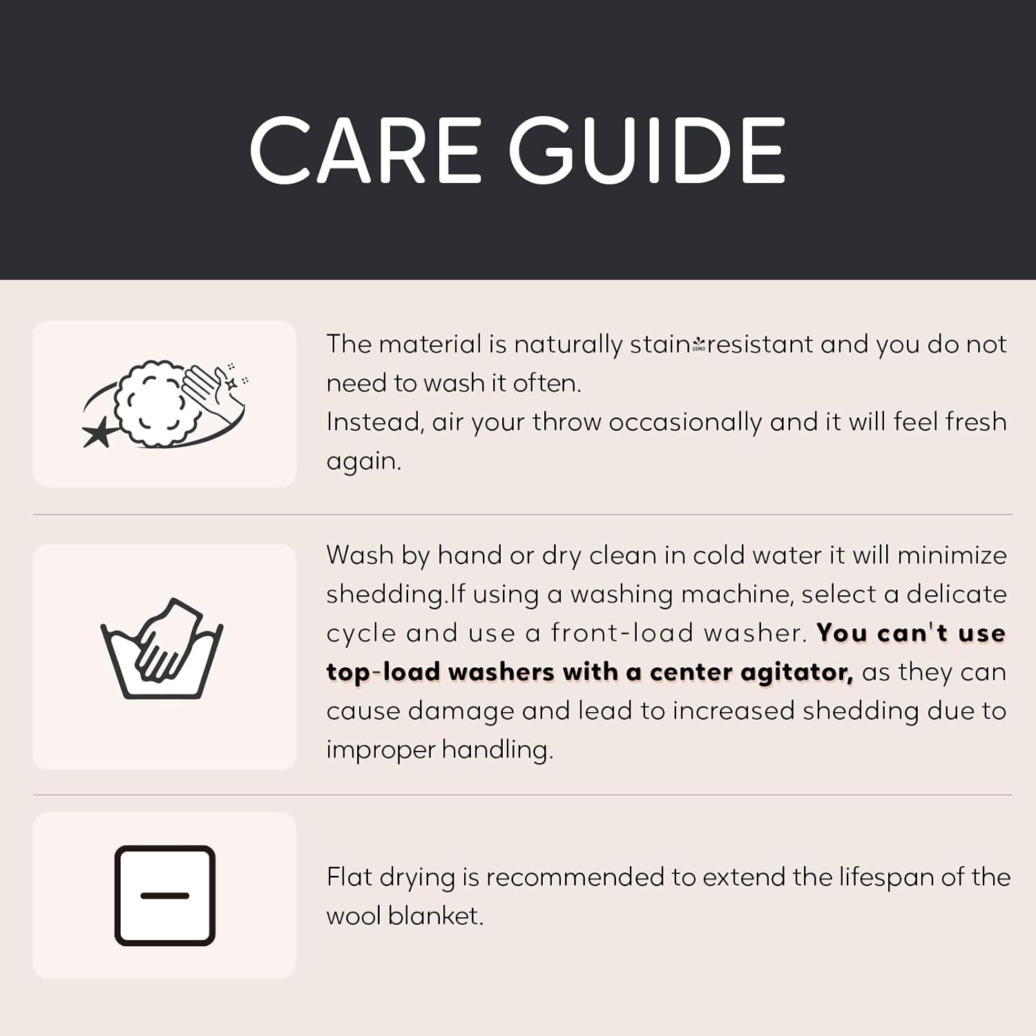 - EASY MAINTENANCE-Thanks to wool blanket, it has self-cleaning function, so it is usually washed once every one or two years.Instead, air your throw occasionally and it will feel fresh again. A little shedding is normal during the first wash, but if you can wash by hand or dry clean in cold water it will minimize shedding. In this way, the wool blanket can be protected and the service life of the wool blanket can be extended, and it may also accompany your life directly.If using a washing machine, select a delicate cycle and use a front-load washer. You can't use the top-load washers with a center agitator, as they can cause damage and lead to increased shedding due to improper handling.