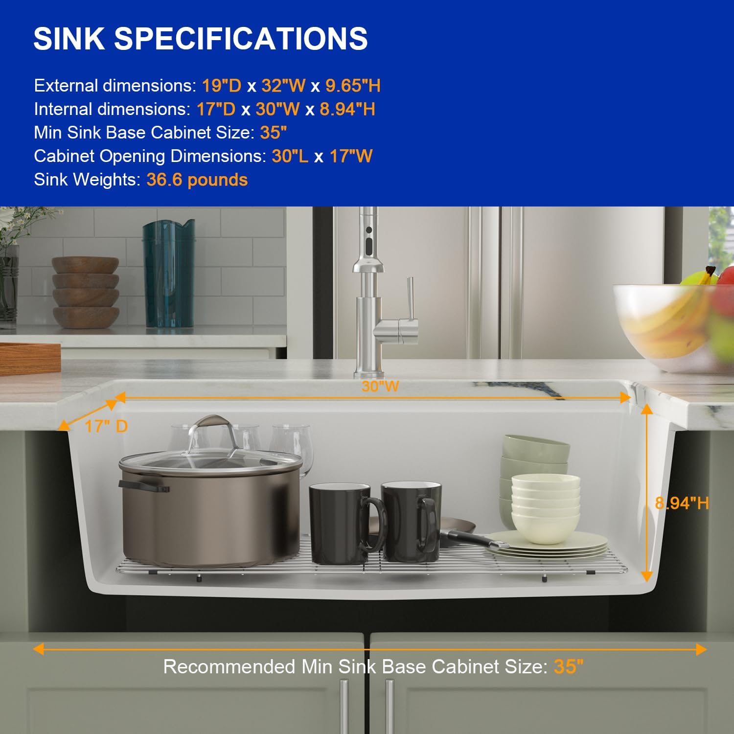 - The spacious 32 inches large size, the inner bowl size reaches 16”D x 30”W x 9”H, can accommodate a large number of tableware; the minimum cabinet base size required for installation is 36”