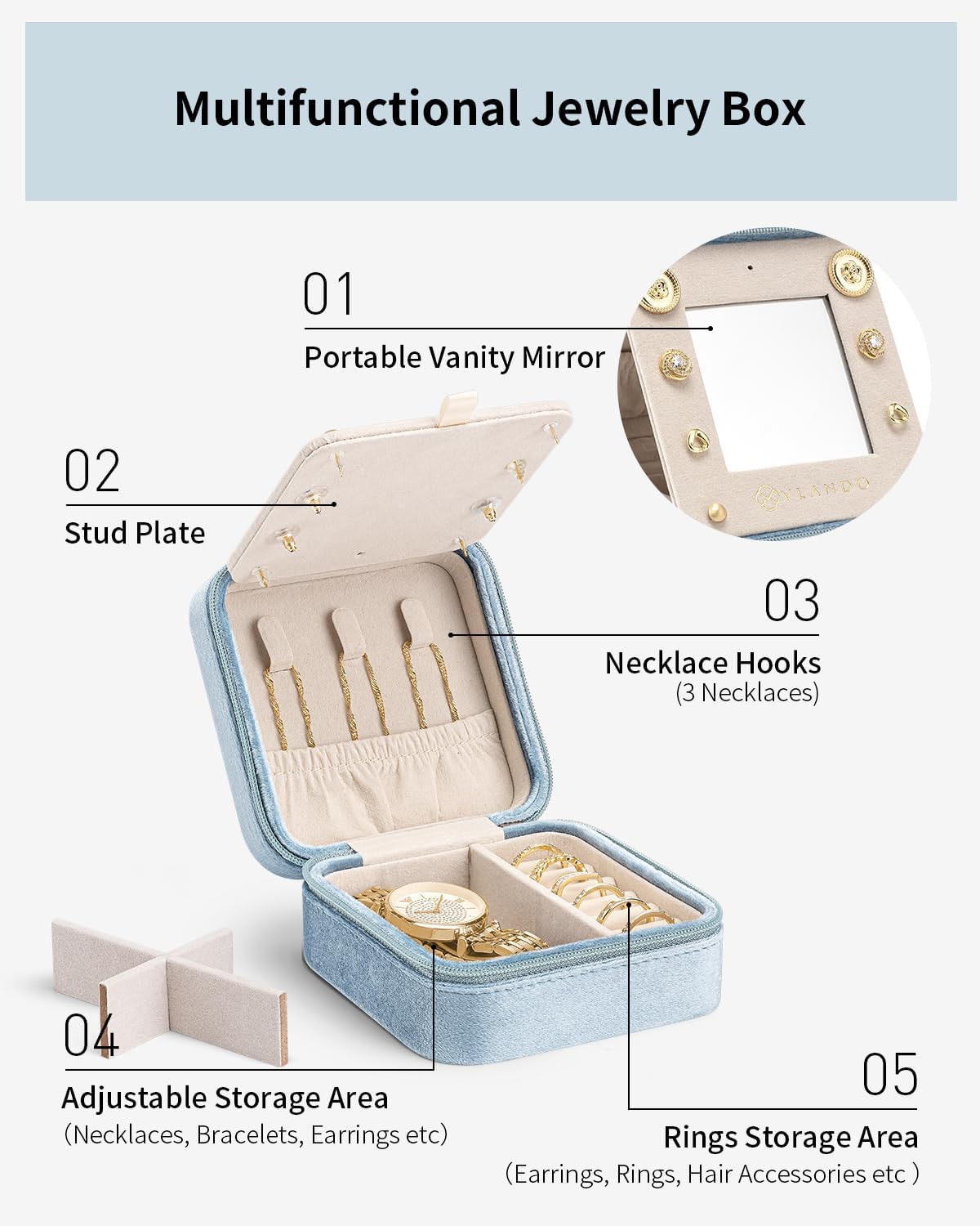 - Soft Velvet Finish - Made from high-quality velvet material for a soft feel, Vlando travel jewelry case comes with a secret earring compartment and a built-in compact mirror. Completed with a gold-colored side zipper for a more classic and stylish look.