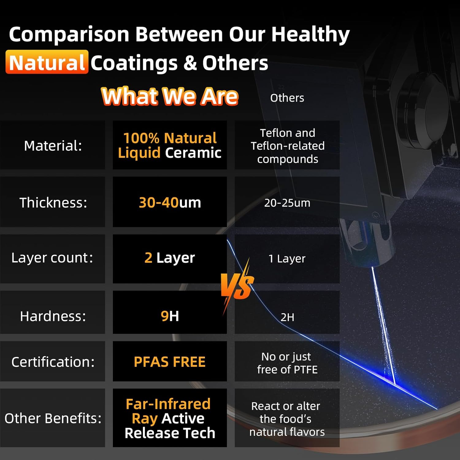 - 9H Diamond-Level Enhanced Coating: The coating achieves 9H hardness, ensuring exceptional resistance to wear, corrosion, and acids. Please note that our ceramic coating serves as an alternative to Tef*l*on. While it’s equipped with ultra non stick feature, it's not *chemically* nonstick.