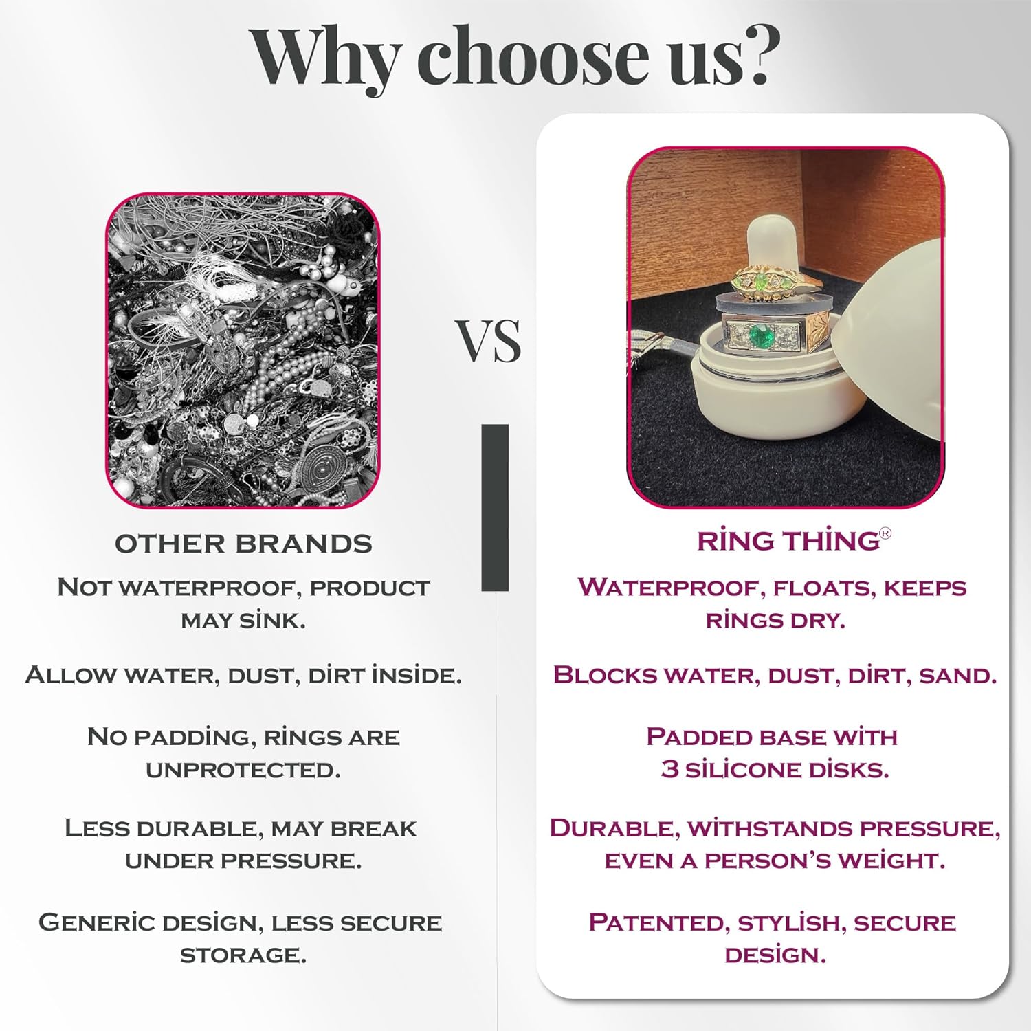 - Waterproof & Floats: Designed with an airtight seal, the Ring Thing is fully waterproof and floats. Protect your rings and jewelry at the gym, beach, golf course, or during any adventure, offering unmatched safety and versatility.