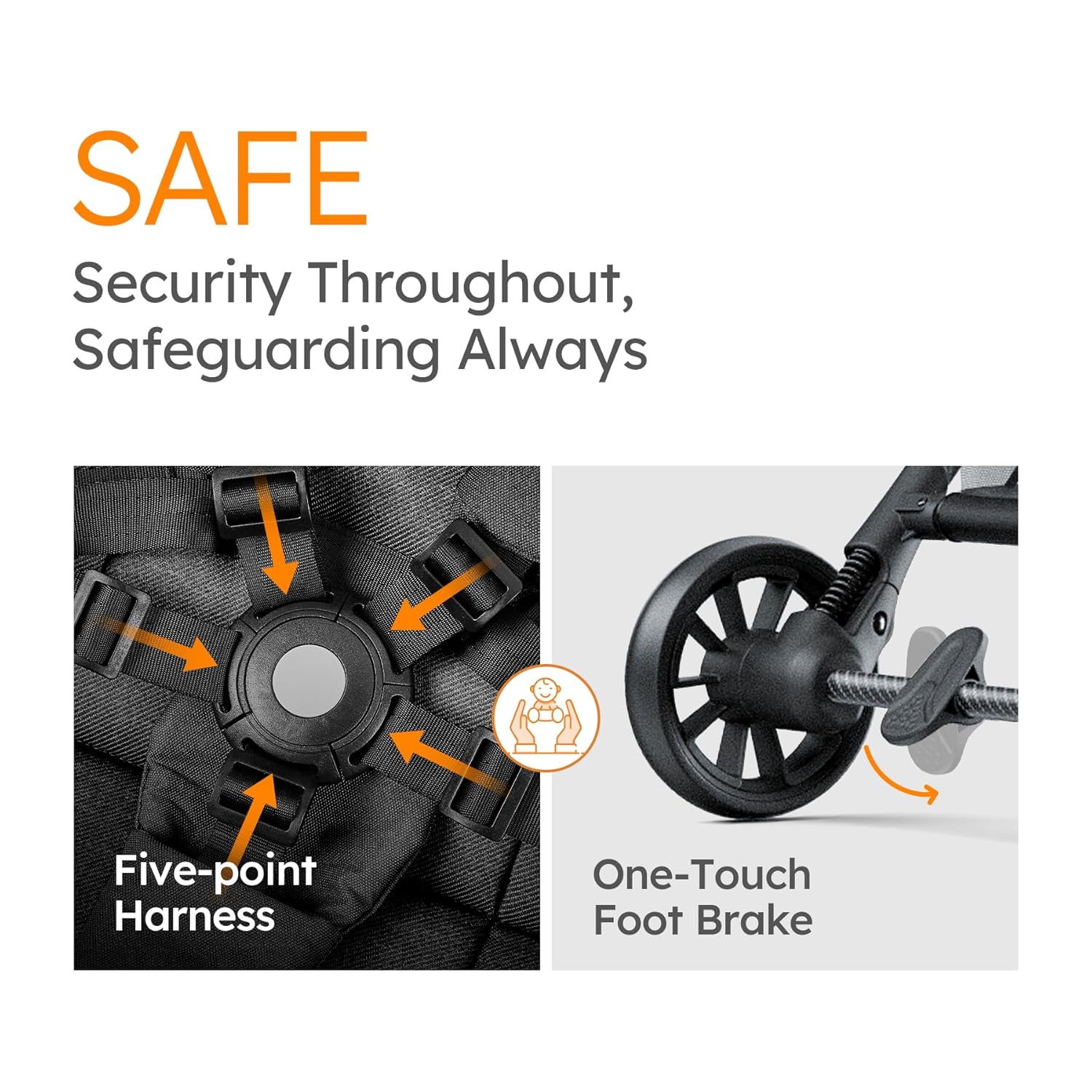 - Comfort Meets Convenience: From exploring to napping, your little one stays cozy with a 100° - 150° reclining backrest and a 2-position adjustable footrest. The UPF 50+ canopy shields your baby from harmful rays, while the peek-a-boo window allows you to check in easily, keeping every trip comfortable and breezy
