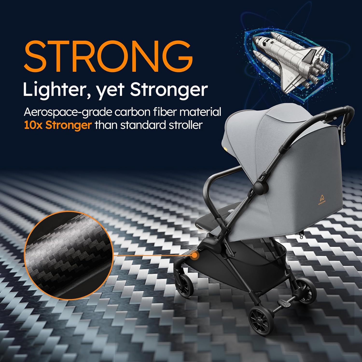 - Ultra-Light Carbon Fiber Frame (<10 lbs):Experience the world’s first carbon fiber stroller under 10 lbs. Built with aerospace-grade materials, the baby stroller delivers superior strength, rigidity, and shock resistance - all while remaining ultra-light and easy to lift with one hand. Perfect for parents who want premium performance without the extra weight