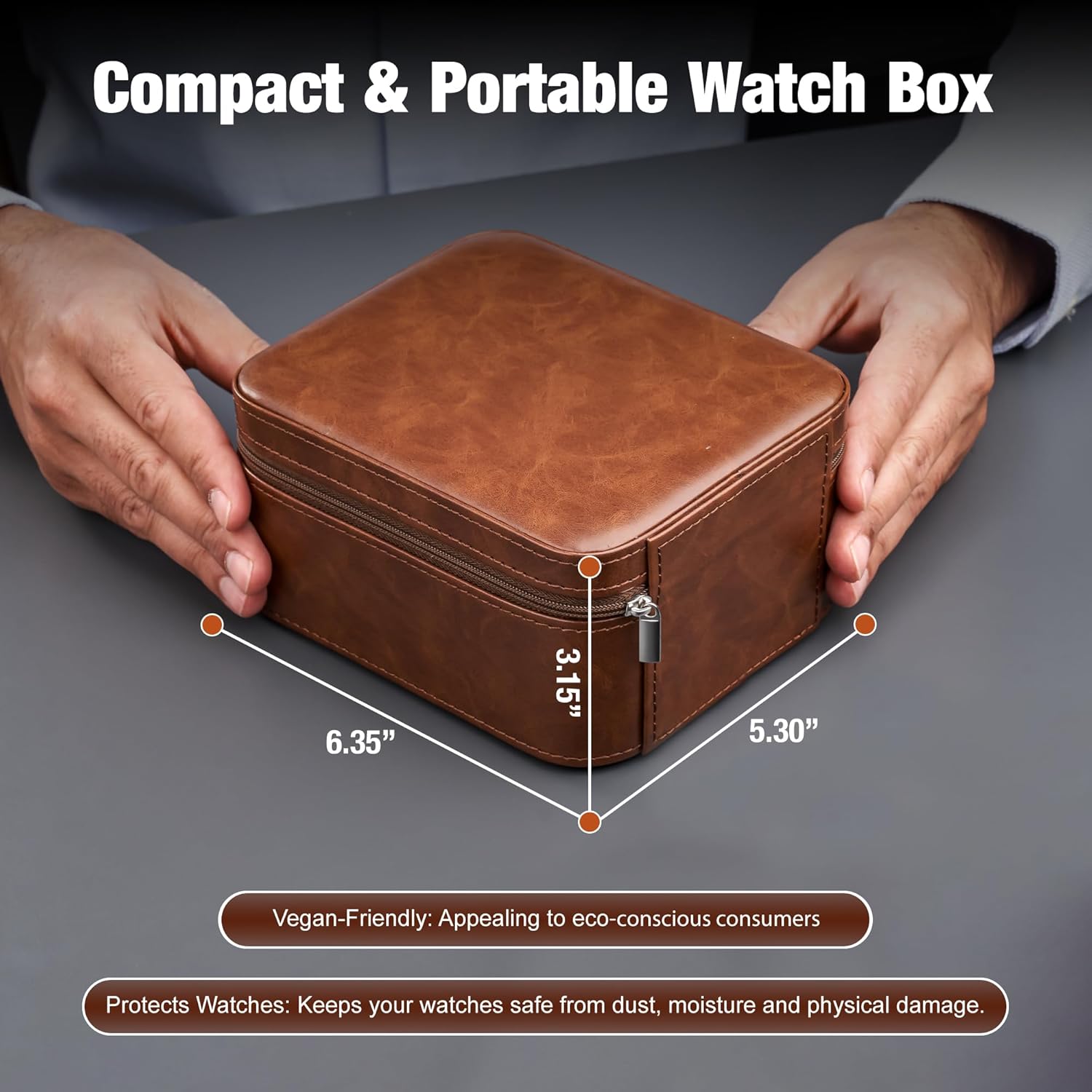 - ✅ Travel-friendly: This portable watch box is the perfect travel companion, keeping your watches secure and protected on the go. DIMENSIONS: 6.34 x 5.31 x 3.15 and 0.67 pounds