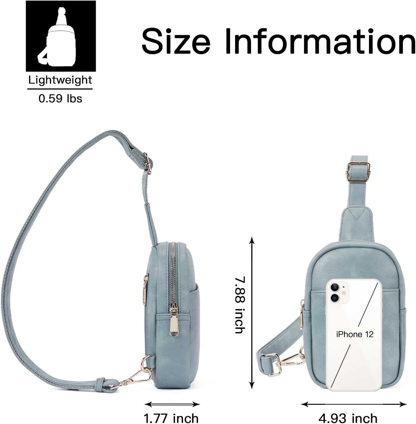 - Multi-way to Carry: Measure as 4.93" x 7.88" x 1.77", Weight: 0.59Lbs. With a adjustable shoulder strap, this crossbody fanny packs for women could be used as a small crossbody purse, sling bag or chest bag even a shoulder bag. With adjustable straps, you can tighten or loosen them to fit your size or activity needs. The length of the straps is 28.57 to 49.64 inches