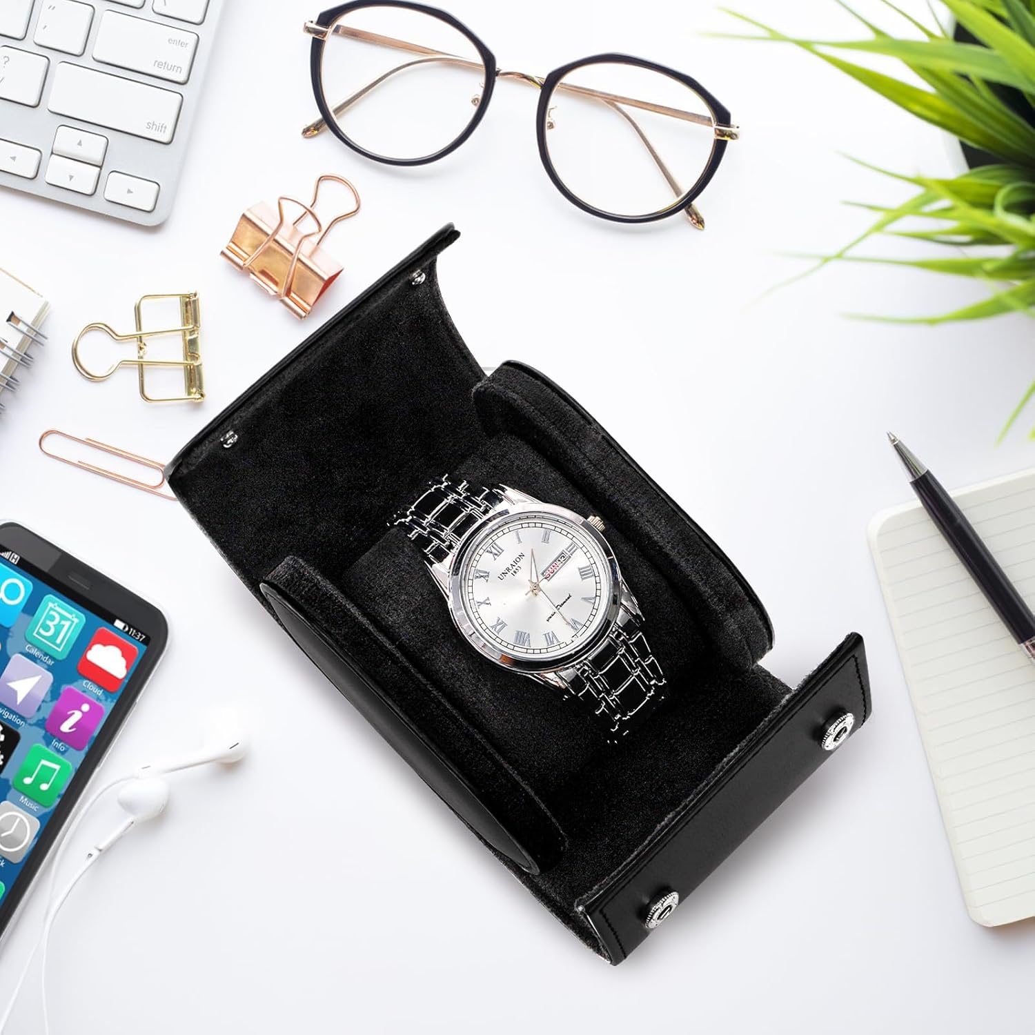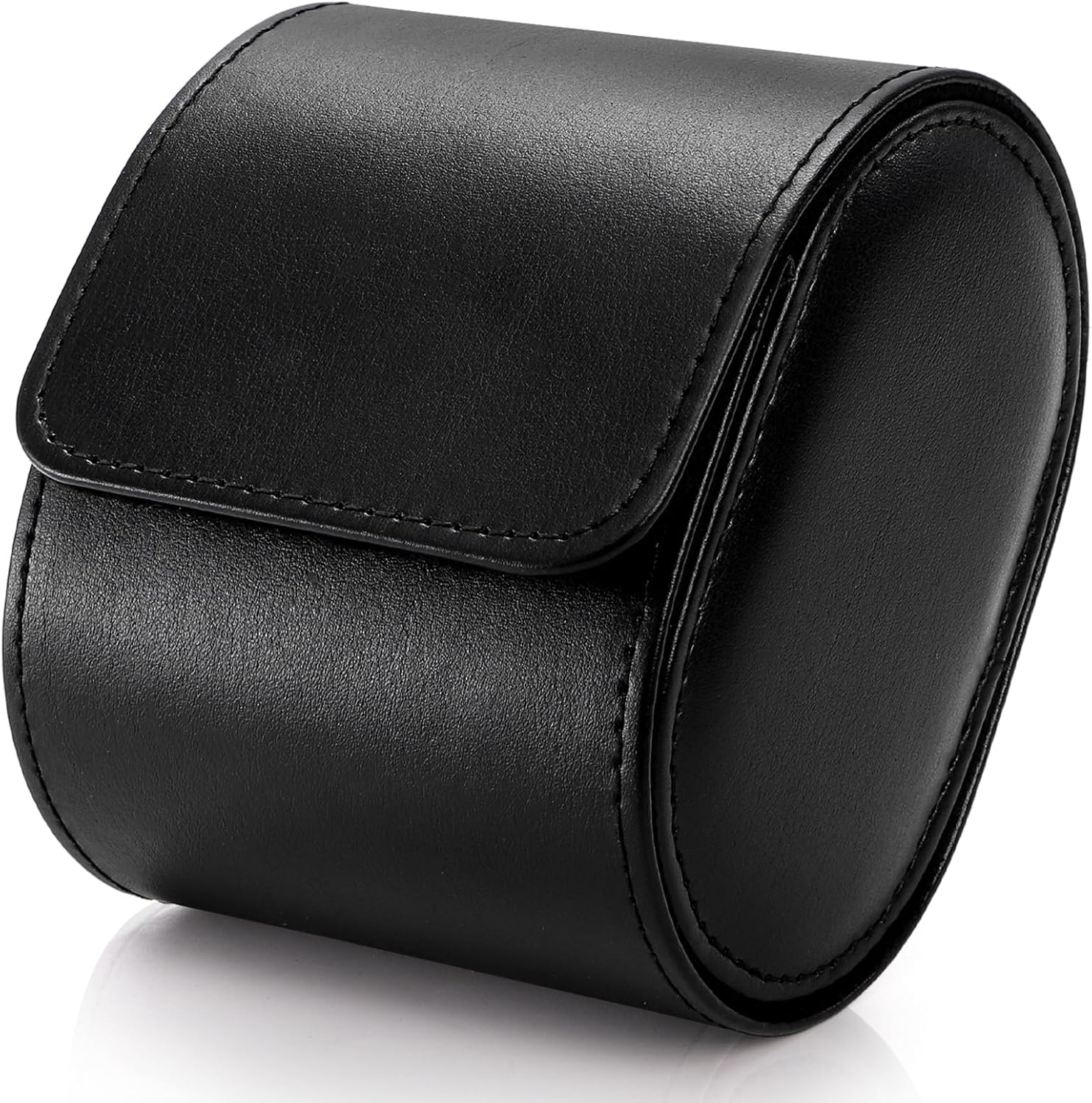 Leather Travel Watch Case, Single Watch Gift Box with Pillow, Portable Jewelry Watch Storage Roll Organizer Carrying Case for Display, Men, Women, Luxury Black