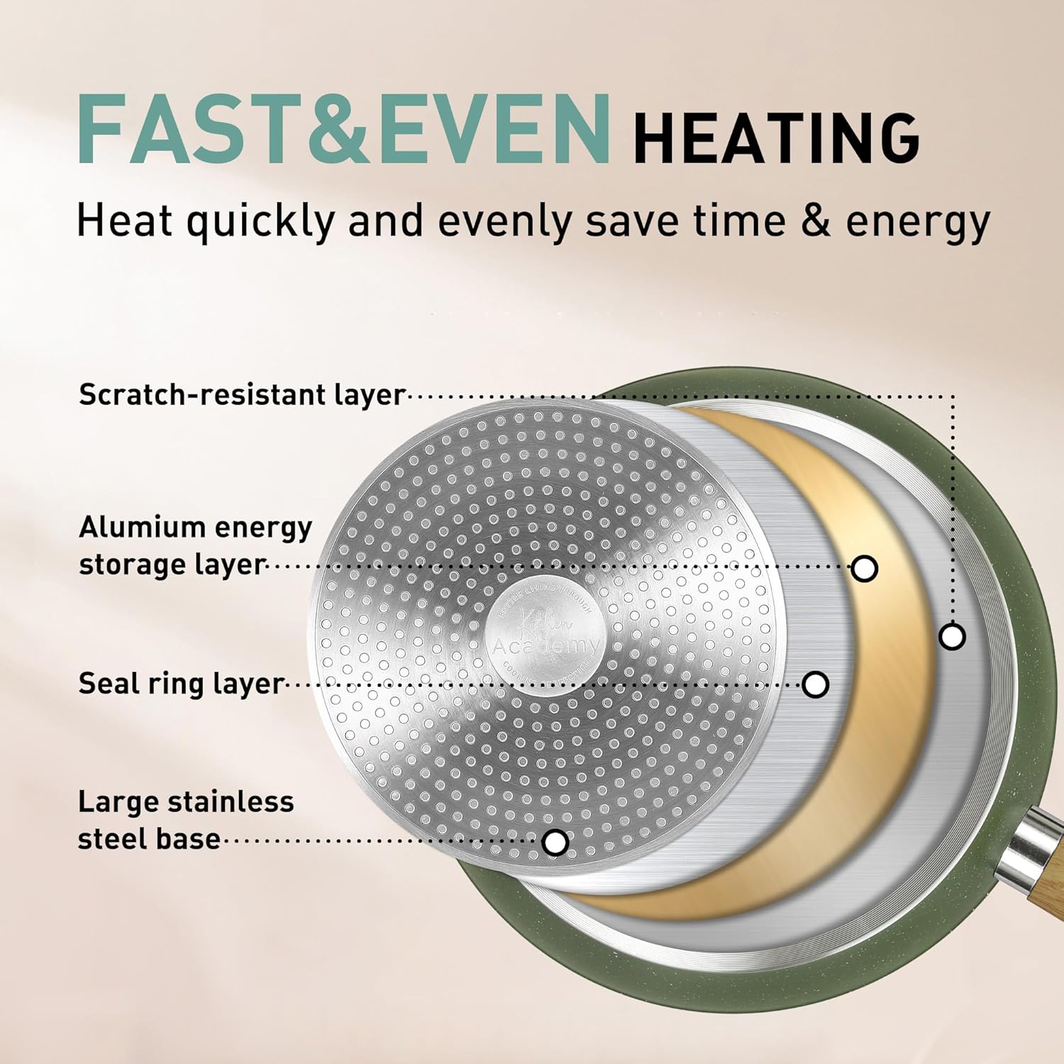 - Wooden Handles and Tempered Glass Lids: The pots and pans come with wooden handles that provide a comfortable and secure grip while cooking. The tempered glass lids allow you to monitor your food without losing heat or moisture