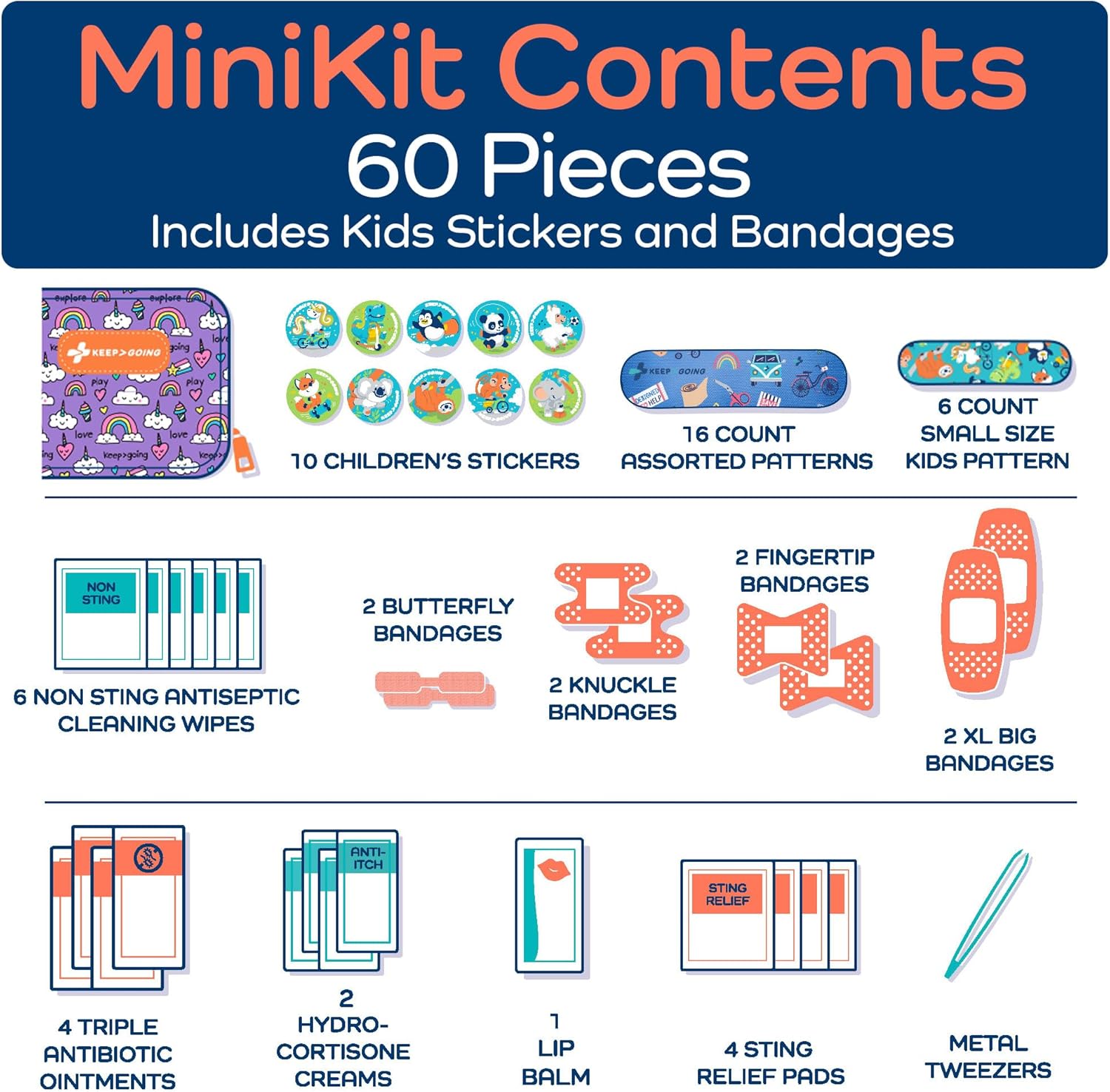 - All You Need – Good things come in small packages! Your mini first aid kit has 60 pieces of essential first aid supplies for every ouchie. From stickers to bandages, you’ll be ready for anything.