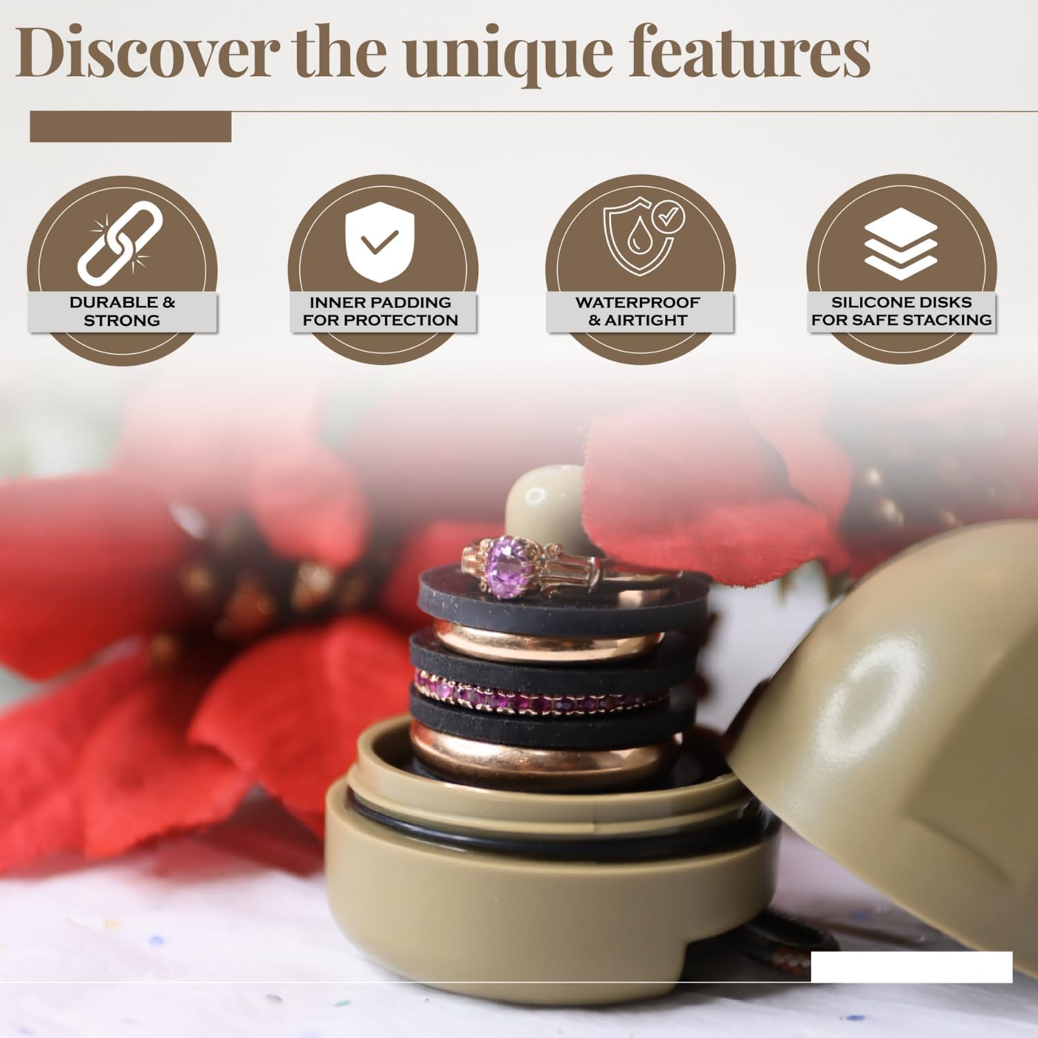 - Padded inner base and 3 silicone disks allow multiple rings to be safely stacked inside.