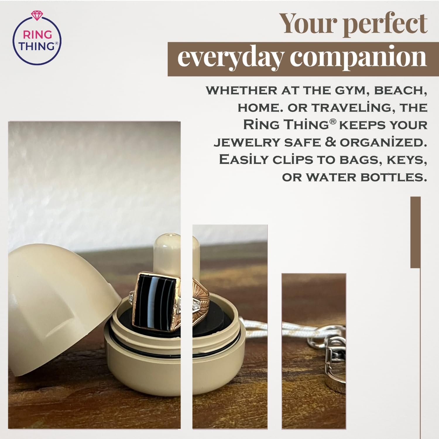 RING THING - Ring Holder Keychain, Jewelry Organizer and Storage, Portable Waterproof Ring Holder, Pill Box Keychain Container, Gym Accessory, and Travel Ring Case (Khaki)