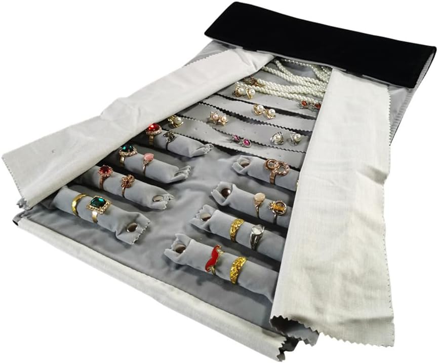 Velvet Travel Jewelry Case Roll Bag Organizer for Necklace Bracelet Earrings Ring (Black) (Black and Grey)