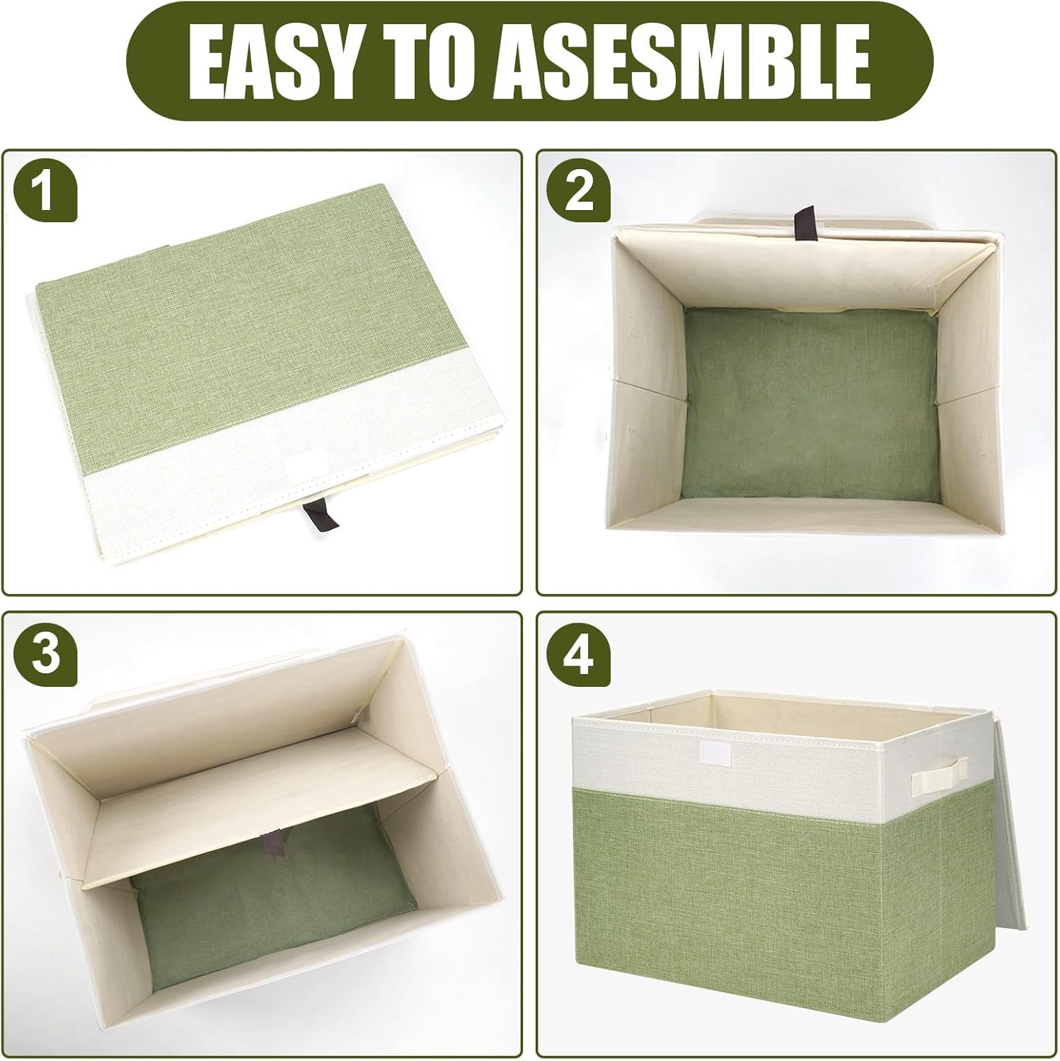 Large 17" 42 Quarts Collapsible Stackable Storage Bins with Lids [3-Pack] Foldable Fabric Linen Storage Boxes Cube, Closet Organizer Baskets with Label for Home (16.7 x 12 x 12", Green & White)