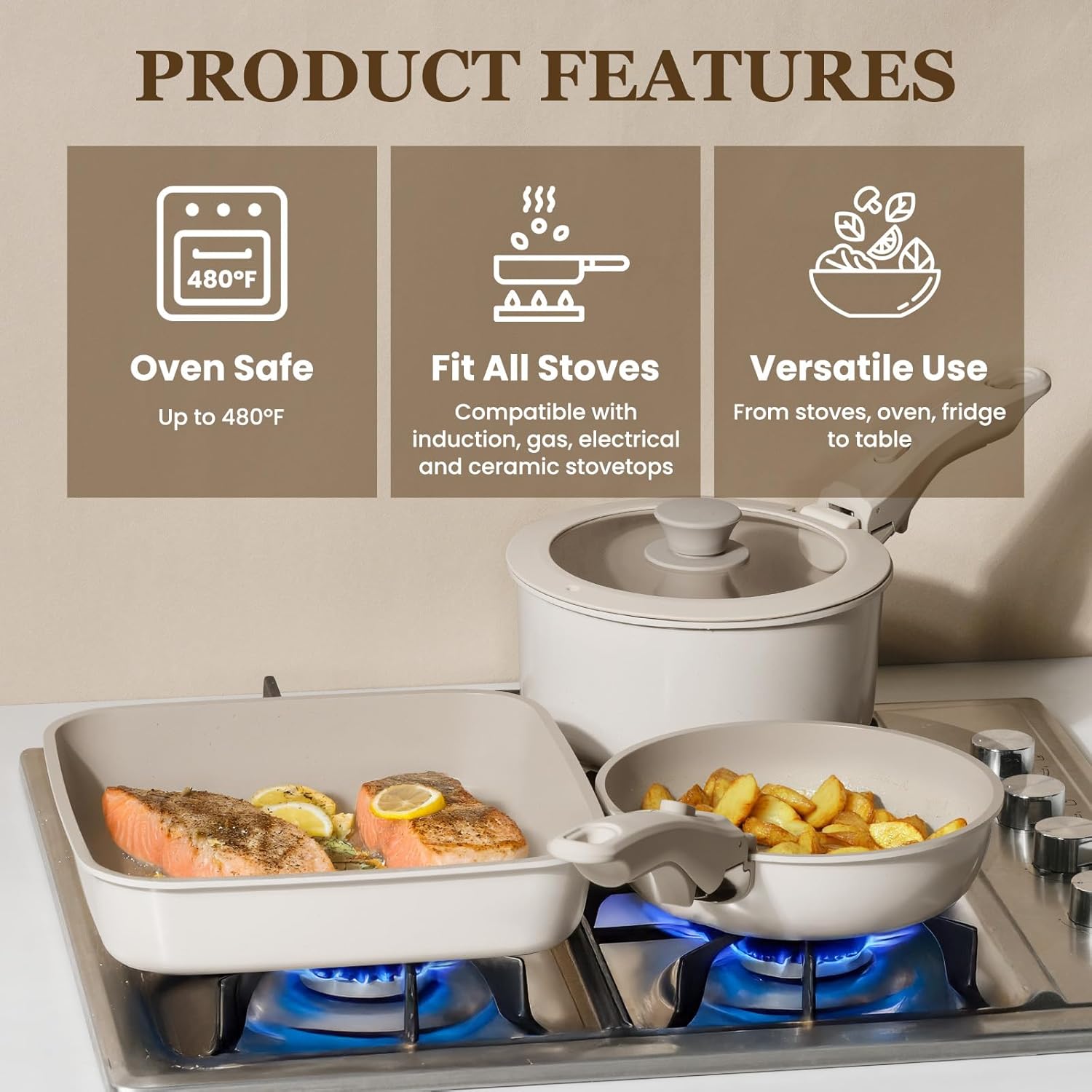 - γπΏπππΌπΎππΌπ½ππ ππΌππΏππ πππ ππΌππ πππππΌππγThese pots and pans set with detachable handles allow for compact storage, sapce saving 70% for kitchen cabinet or organized in drawer, especially great for RV or small apartment. the reinforced removable handles can support up to 24 pounds, ensuring a secure grip and enhancing your cooking experience without the worry of breaking.