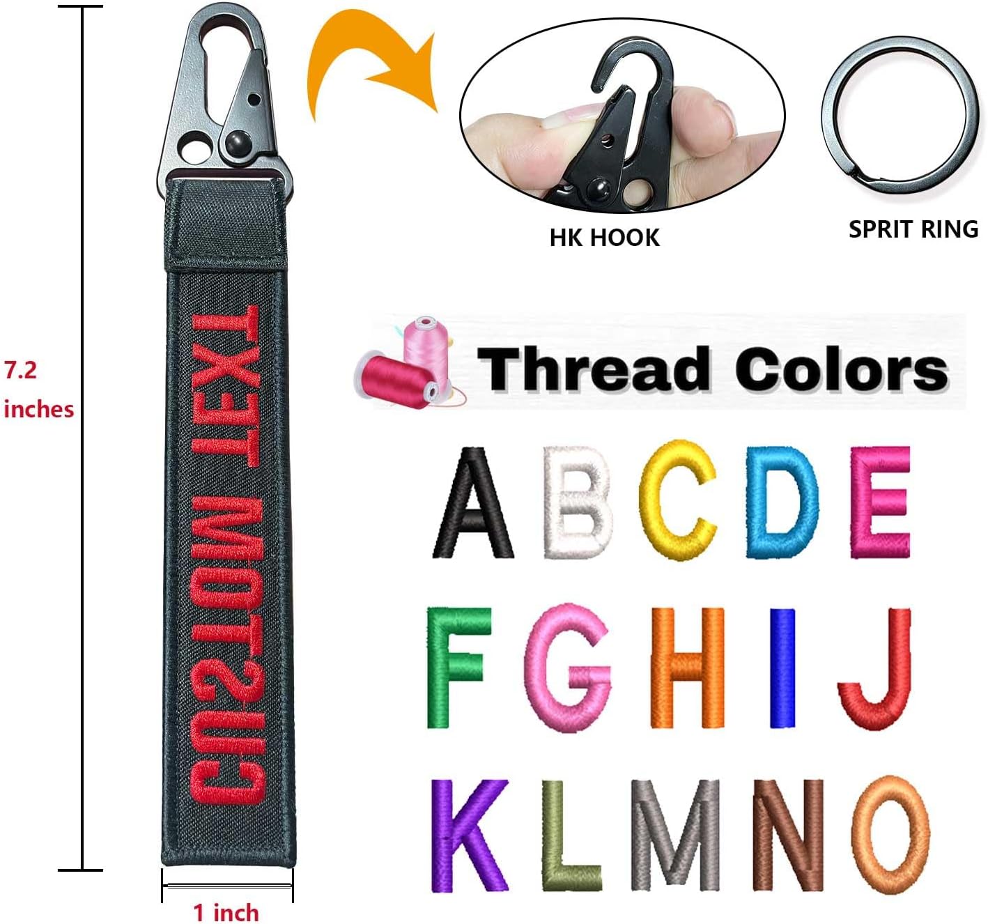 - Keychain Size- 18cmx2.5cm (Lenght 7.2 inches By Width 1.0 inches), the size Eagle beak hanging buckle is 4.5cm. customized keychain is designed as double-sided embroidery, which can be the same or different text.For example, your name, number, birthday, wedding anniversary, interesting slogans, etc Exquisite embroidered text, clear and easy to read