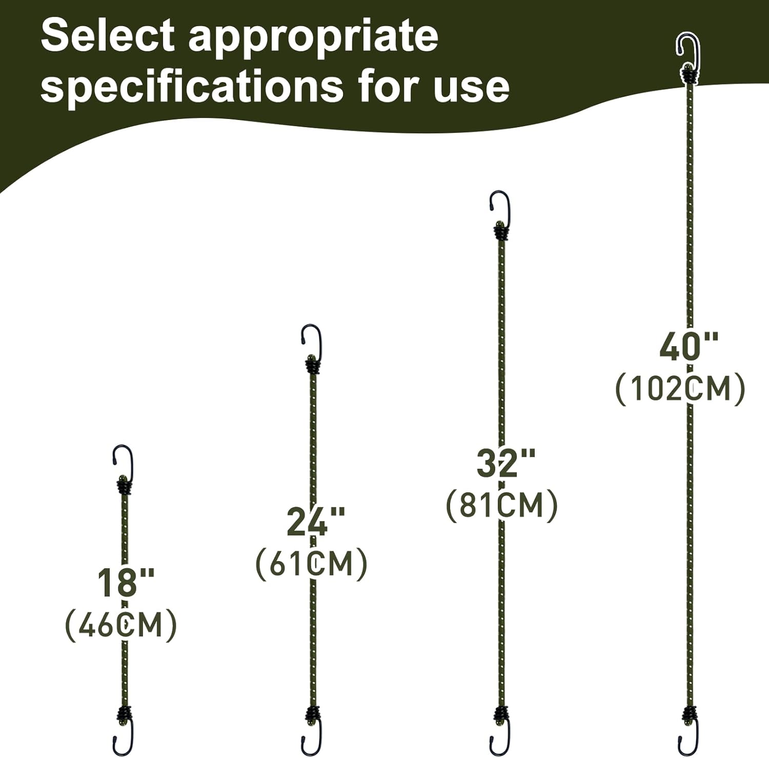 - Stretchability: bungee cords Green) 18 inches 4pcs; can be stretched to 28 inches when used, excellent stretchability; easy to fix items.