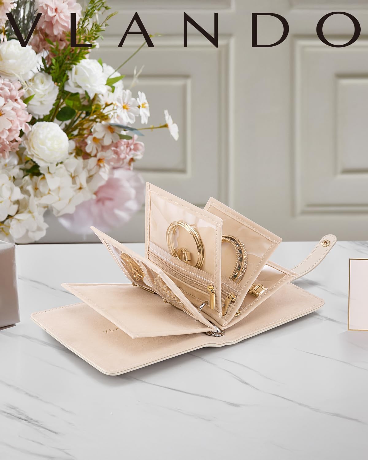 Vlando Travel Jewelry Organizer Case,Mothers Day Gifts for Her,Portable Jewelry Organizers Storage Book with Clear Zipper Velvet Jewelry Pouch Bag for Travel Essentials,Ring,Earring-Cream White