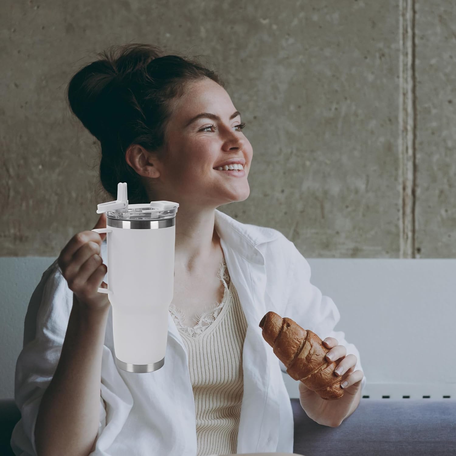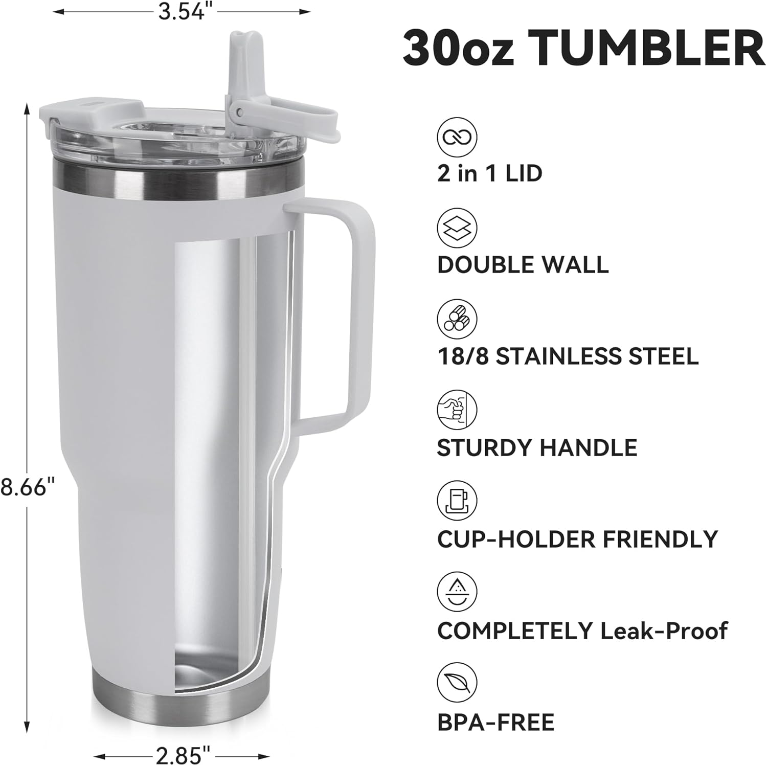 30oz Tumbler with Handle, Insulated Leak Proof Coffee Travel Mug with Straw Lid Double Wall Stainless Steel Vacuum Tumblers Metal Cup Keep Hot and Iced Drink for Gym, Office, Camping, White 1 Pack