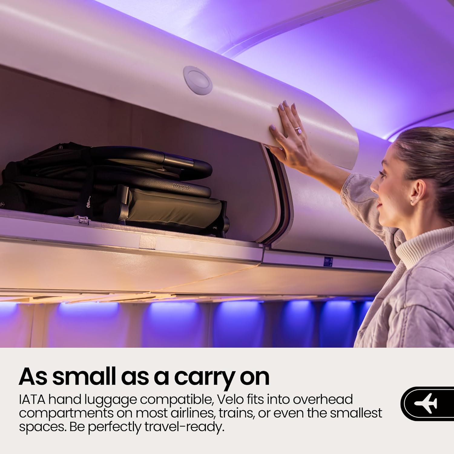 - Overhead Friendly: IATA hand luggage compatible, the Velo fits into overhead compartments on most airlines, trains, or even the smallest spaces. Ultra-compact fold: 17x8x20 in