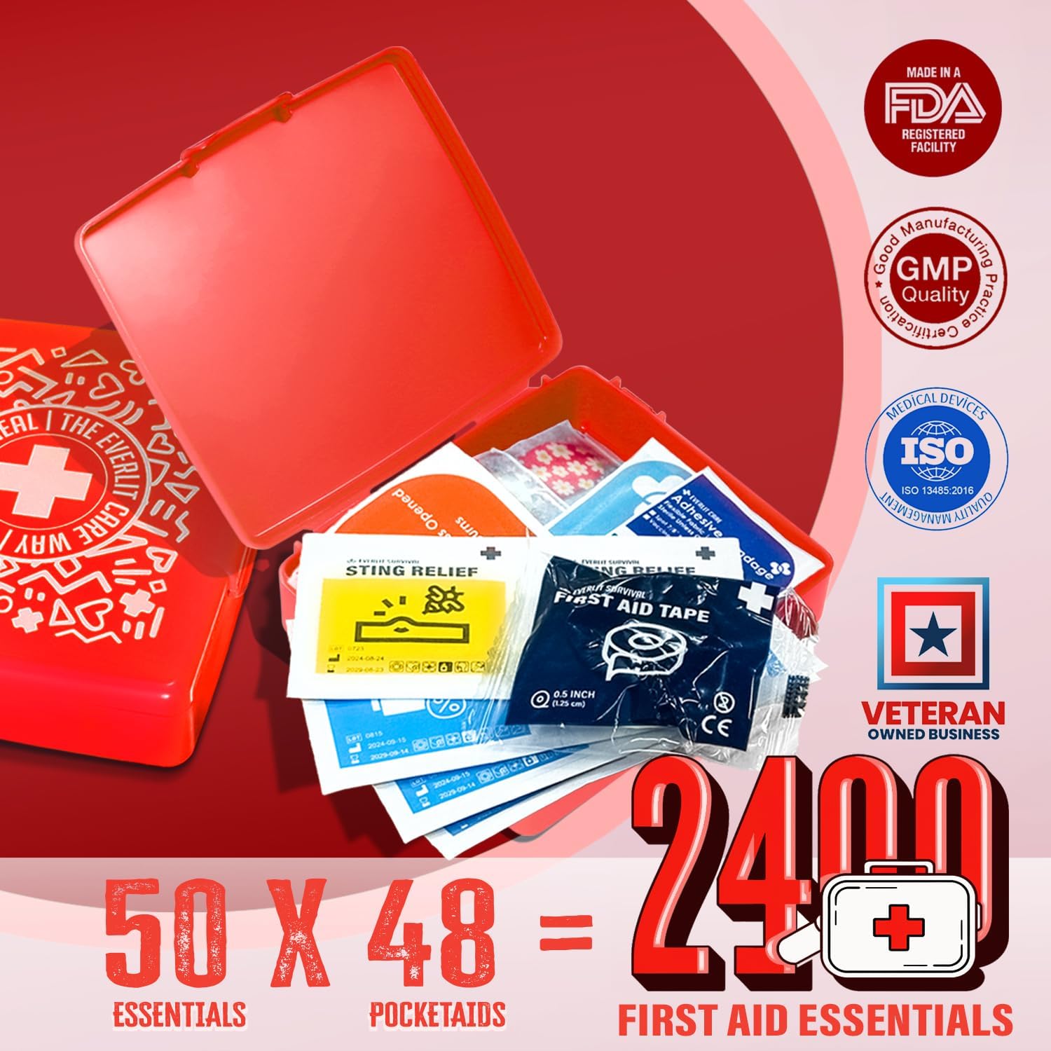 EVERLIT Pocket-Aid Mini First Aid Kit | Compact, Portable Hard-Shell Cases of 50 Items | Cuts, Scrapes, Wound Care Essentials for Travel, Outdoor, School, Camping, Home, Office (48 Packs | 2400 Pcs)