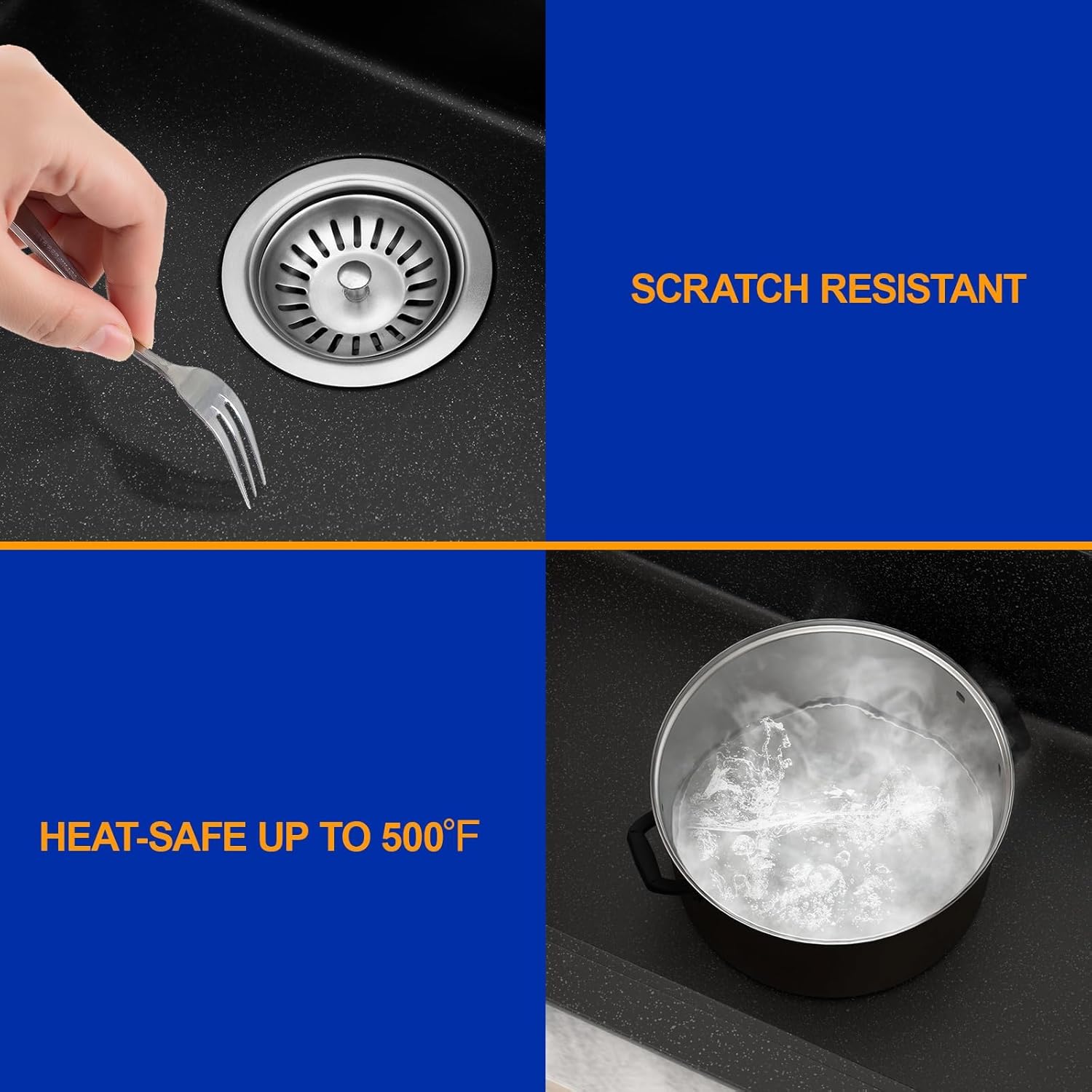 - Durable & Heat-Tolerant:Crafted from high-hardness quartz, the sink endures temperatures up to 500℉, allowing direct contact with hot cookware and water without easily damaging, ensuring long-lasting