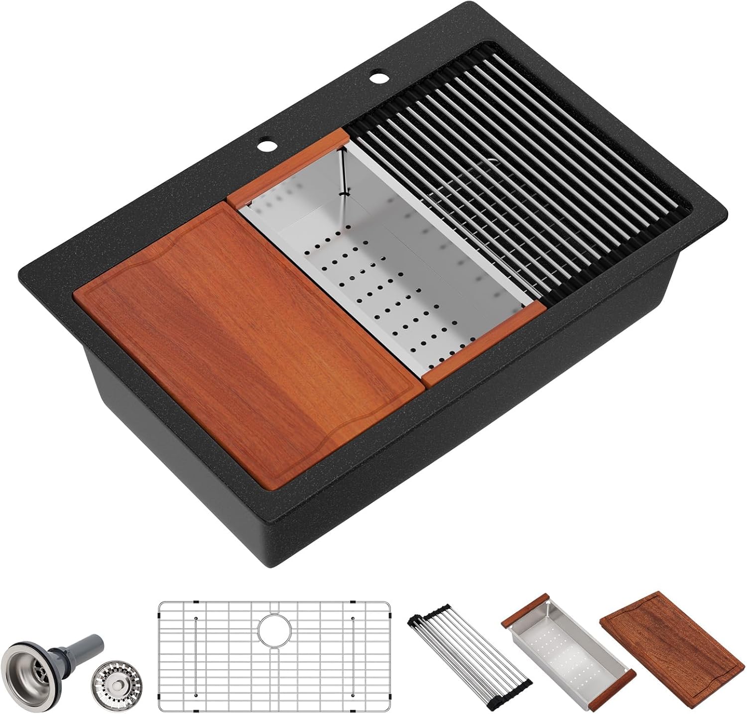 Dcolora 33x22 Drop In Kitchen Sink Black, Granite Composite Black Kitchen Sink Multifunctional Topmount Large Single Bowl Workstation Sinks #DC-0001GBT, 33" x 22" x 10"