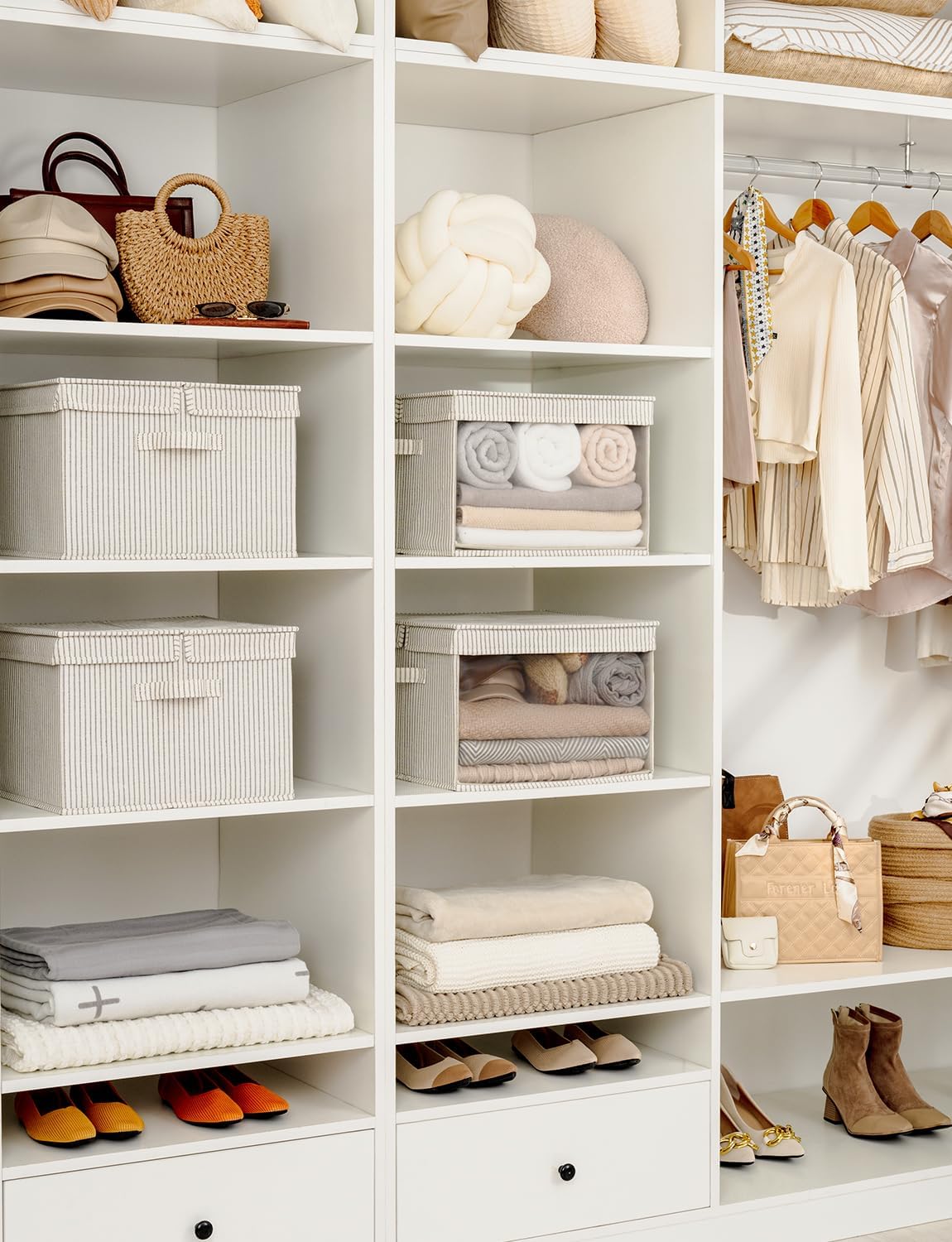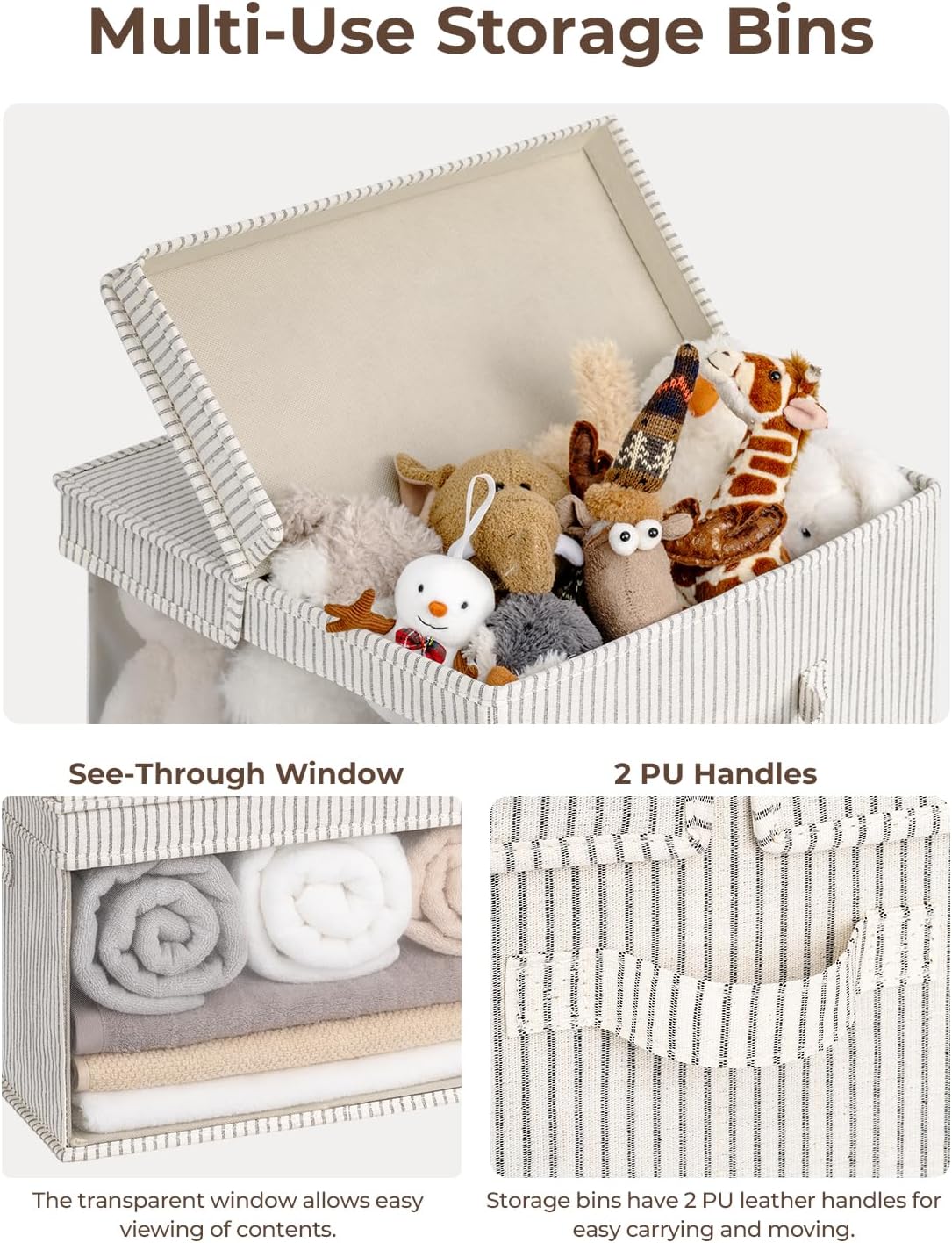 StorageWorks Storage Bins with Lid and Clear Window, Fabric Storage Boxes with Lids, Stackable Basket for Shelves, Closet Organizer and Storage Bins, Khaki and Beige Stripes, Jumbo, 4-Pack