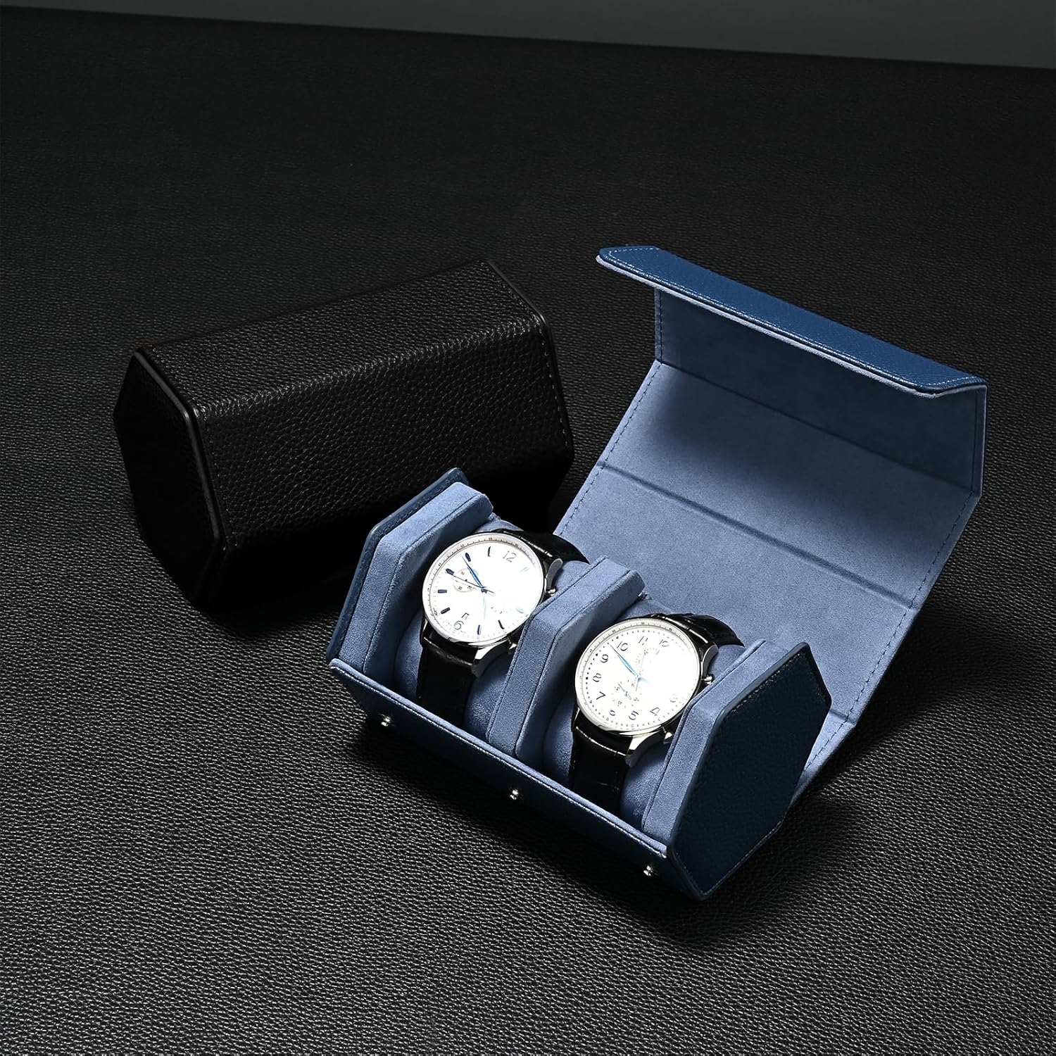 Oirlv Luxury Hexagonal Leather Watch Travel Case Watch Organizer Case for Men Portable Jewelry Storage Roll Organizer(2-Slot,Blue)