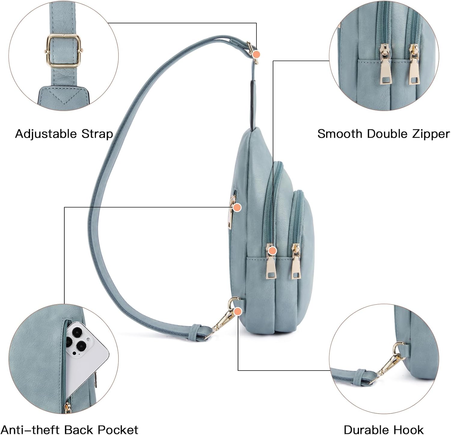 - Multi-functional: Comes with two main compartments, including five card slots in the front zip pockets, and a big slot pocket in the back. Moreover, there also have an anti-theft zipper pocket in the back to keep your belongings secure. This leather sling bag is the perfect everyday essential. It's just big enough to store your keys; phone; wallet; passport and other small valuables you may need for a day out, allowing you to move freely while having quick and easy access to your belongings