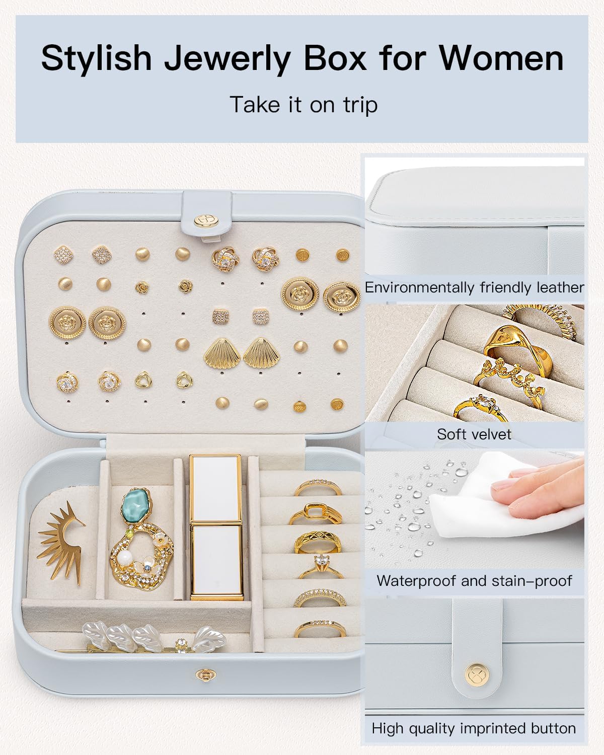 - Ideal Dimensions and Easy to Carry - This compact jewelry organizer boasts a robust construction with an adorable design, measuring 6.3 x 4.6 x 2.2 inches. It's spacious enough to accommodate your jewelry collection while remaining compact to conserve space. Weighing a mere 9.45 ounces, it's exceptionally lightweight, making it perfect for tossing in a suitcase or slipping into a drawer, offering supreme convenience for travel.
