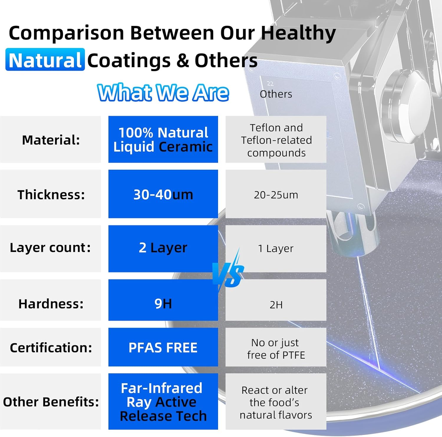 - 9H Diamond-Level Enhanced Coating: The coating achieves 9H hardness, ensuring exceptional resistance to wear, corrosion, and acids. Please note that our ceramic coating serves as an alternative to Tef*l*on. While it’s equipped with ultra non stick feature, it's not *chemically* nonstick.