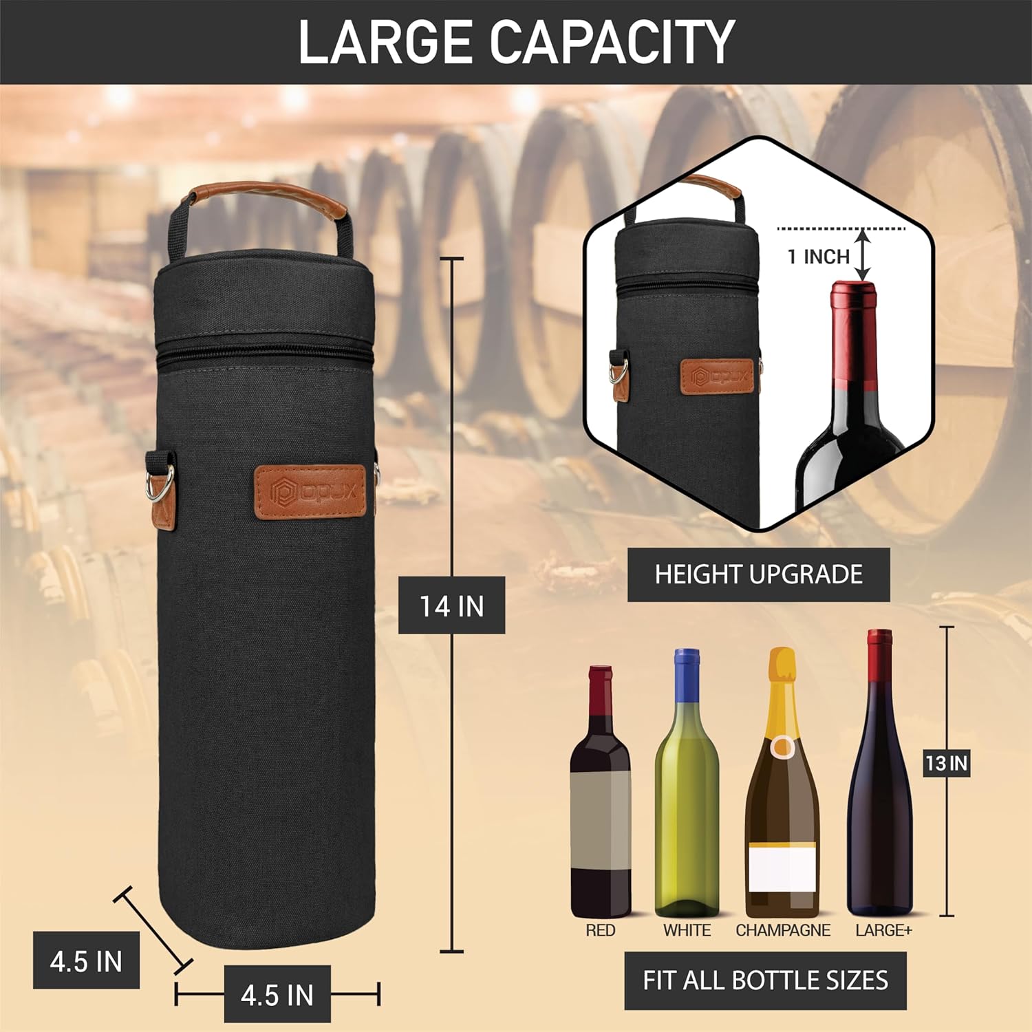 - PREMIUM PICNIC WINE CHILLER: OPUX premium insulated one bottle wine tote carrier measures 14 x 4.5 x 4.5 (H x L x W). | Fits most standard 750ML wine bottles. Made from high-quality 600D polyester to ensure maximum durability and PU leather trim for a touch of elegance. Zipper secured closure with adjustable removable shoulder strap and top handle for convenience. Classy wine bag set also carry other alcohol bottles such as liquor, champagne, spirits, drinks, beer, and wine glasses.