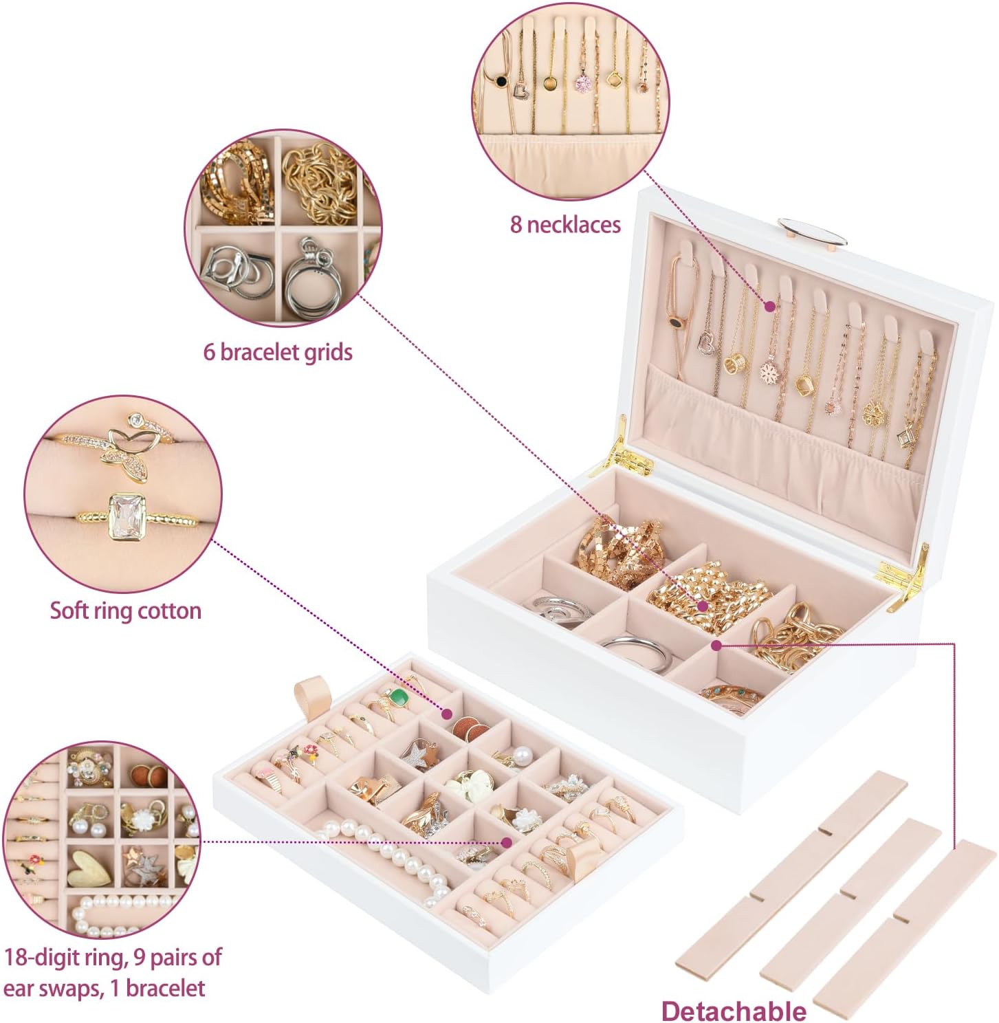 Small Jewelry Organizer for Women, 2-Layer Travel Jewelry Box with Portable Case, Necklace Ring Storage for Dresser, Girls Teens Gifts (White)