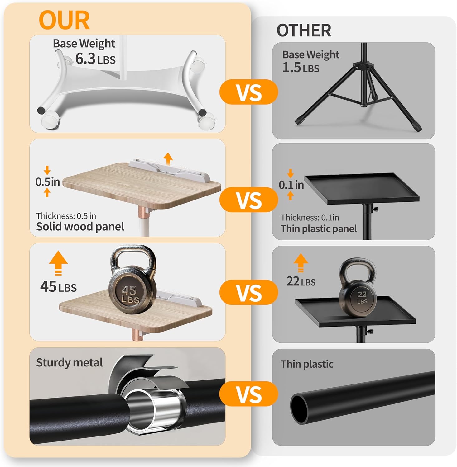 - Height and Angle Adjustable: This tall laptop stand adjusts from 17.5 to 52 inches in height and tilts from 0° to 65°, ensuring ergonomic comfort. Whether sitting or standing, it reduces spinal and eye strain. It’s also perfect for projector use, allowing easy angle adjustments for a clear, aligned image