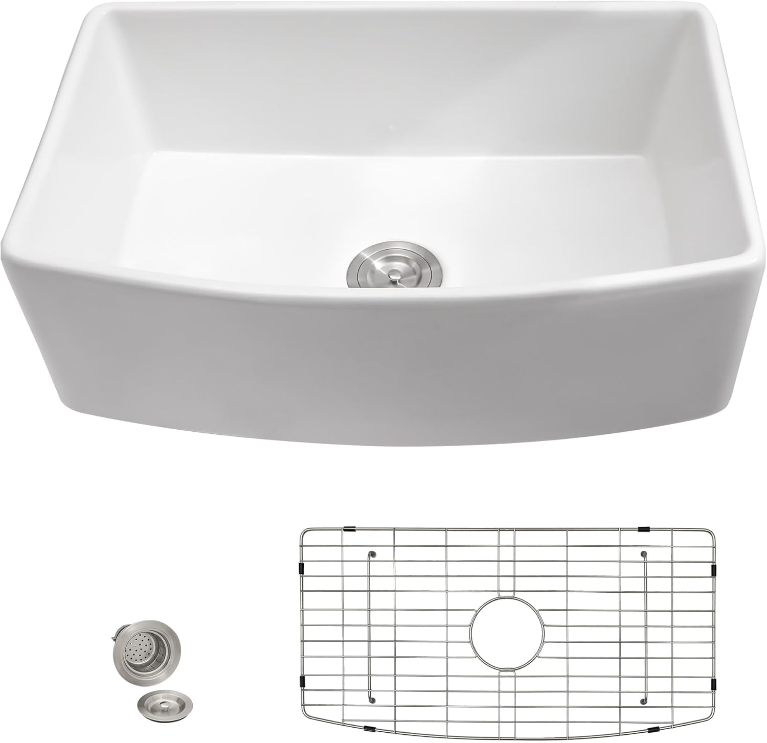 - 33 inch white curved apron front farmhouse sink is made of premium natural fire-resistant clay, fired at 2900°F, with an enamel high-gloss finish that makes it resistant to chips, fading and scratches, and sturdy enough to withstand high-temperature cookware.
