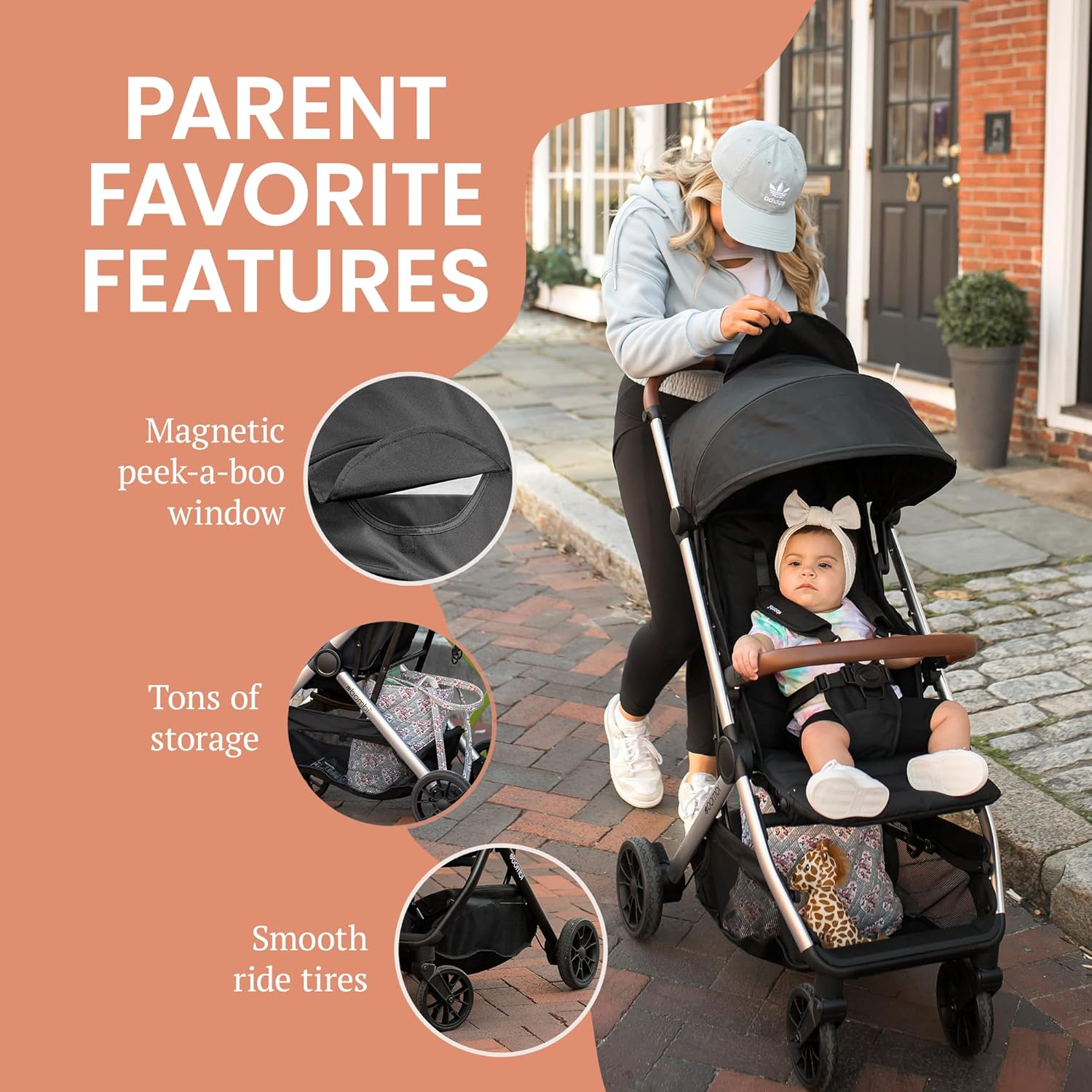 - Tons of Storage Space: Designed for parents on the go, this airport stroller features an XL easy-access storage basket with a hidden pocket, a rear parent zip pocket, and an in-seat child pocket for drinks. This toddler stroller has small side pockets that securely hold AirTags for trips to Disney and beyond, plus a cup holder is included for added convenience.